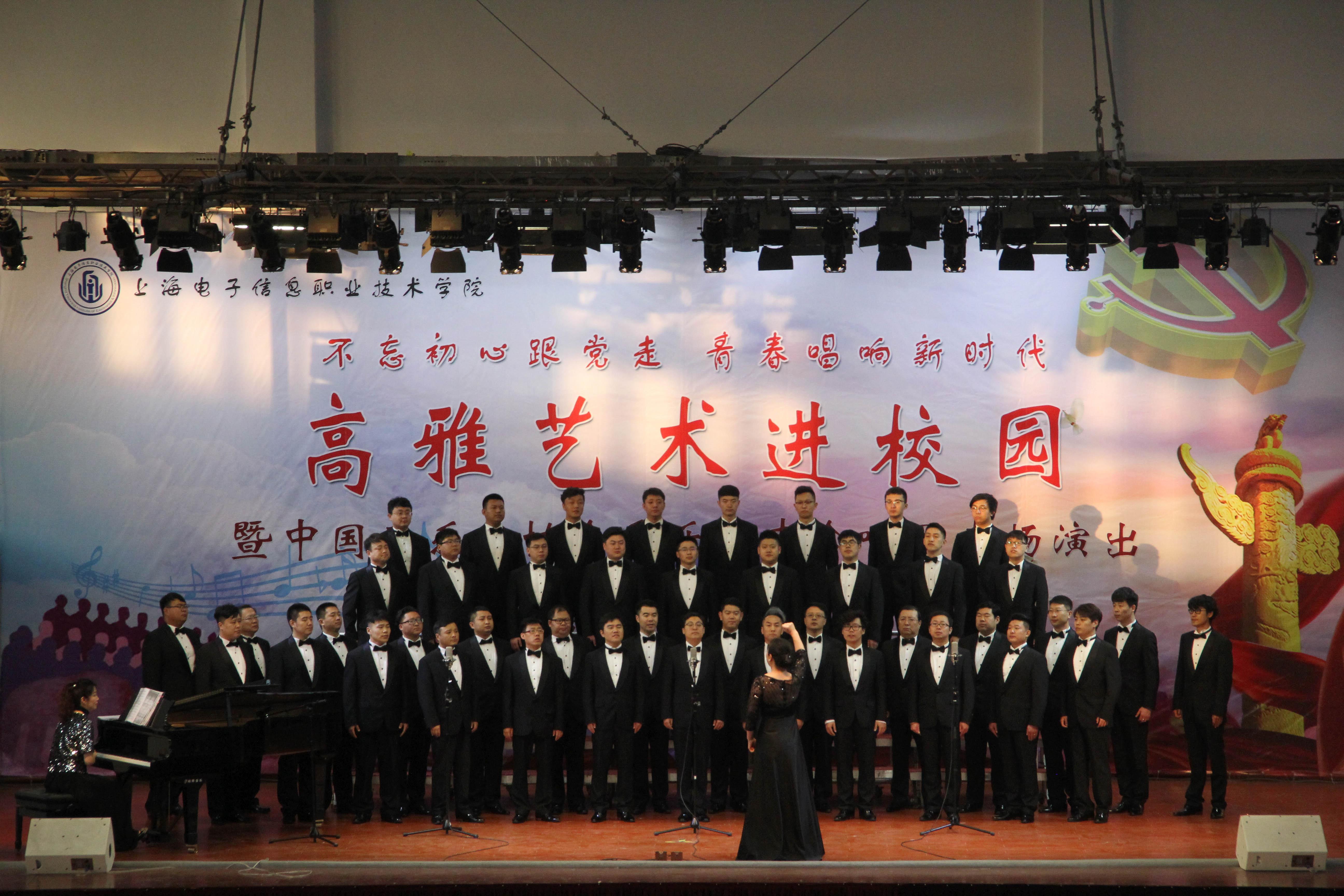58日晚18时,由教育部、文化部、财政部支持的 “不忘初心跟党走,青春唱响新时代”2018年高雅艺术进校园暨中国音乐家协会爱乐男声合唱团专场演出在上海电子信息职业技术学院室内体育馆隆重举行。学校党委书记田钦、学校党委副书记、副校长顾剑锋、副校长张涛以及全校800余名师生代表观看了本次演出。