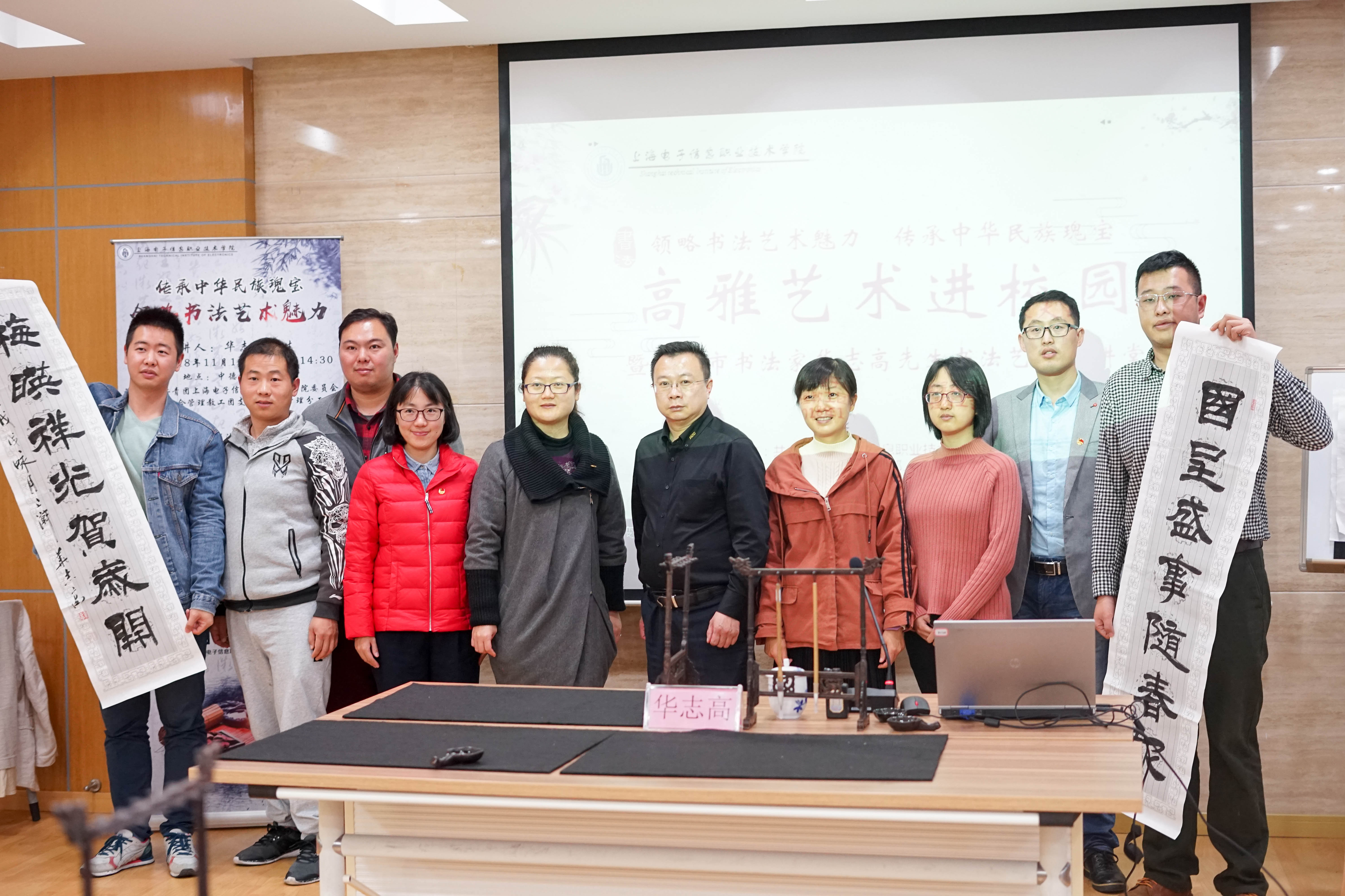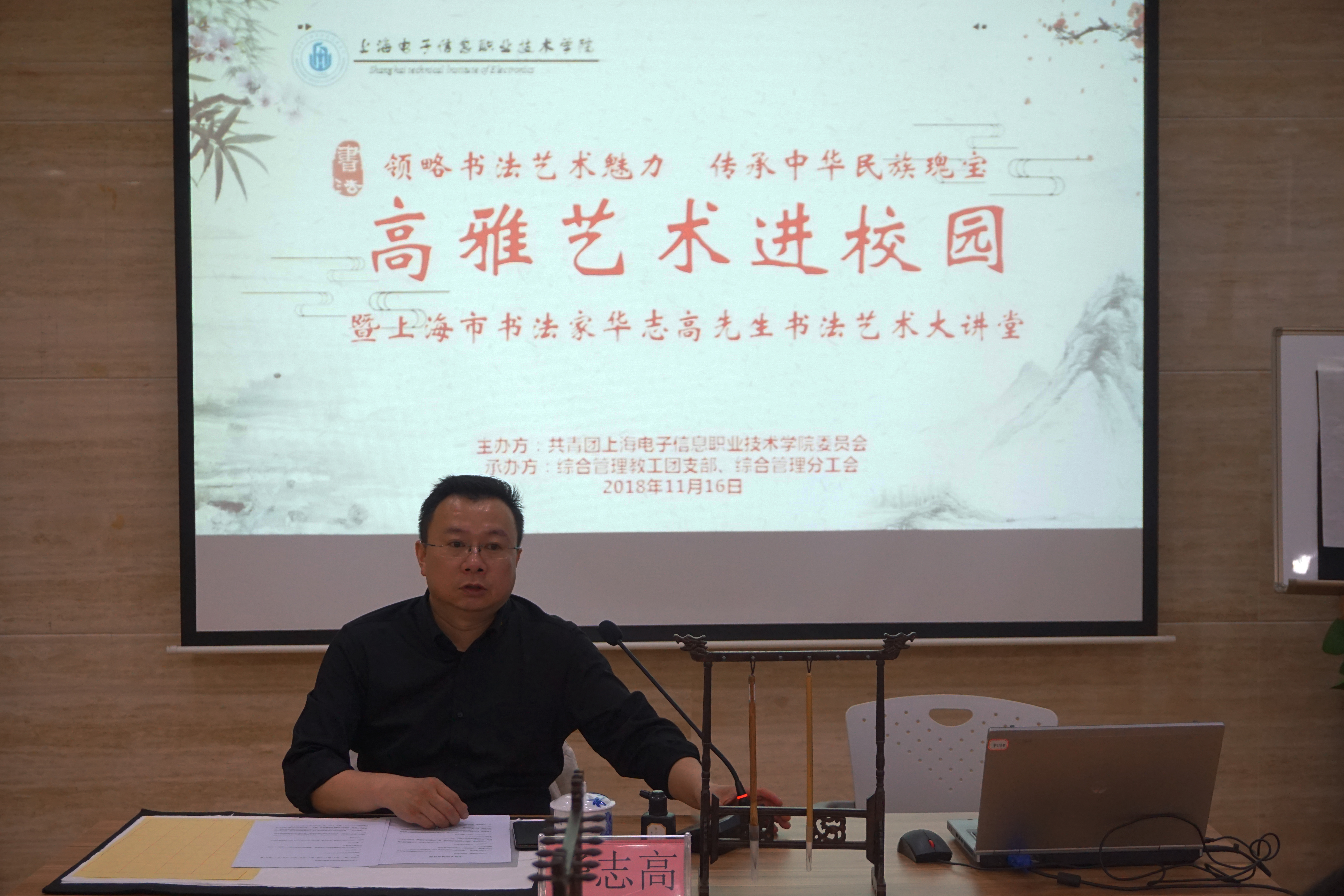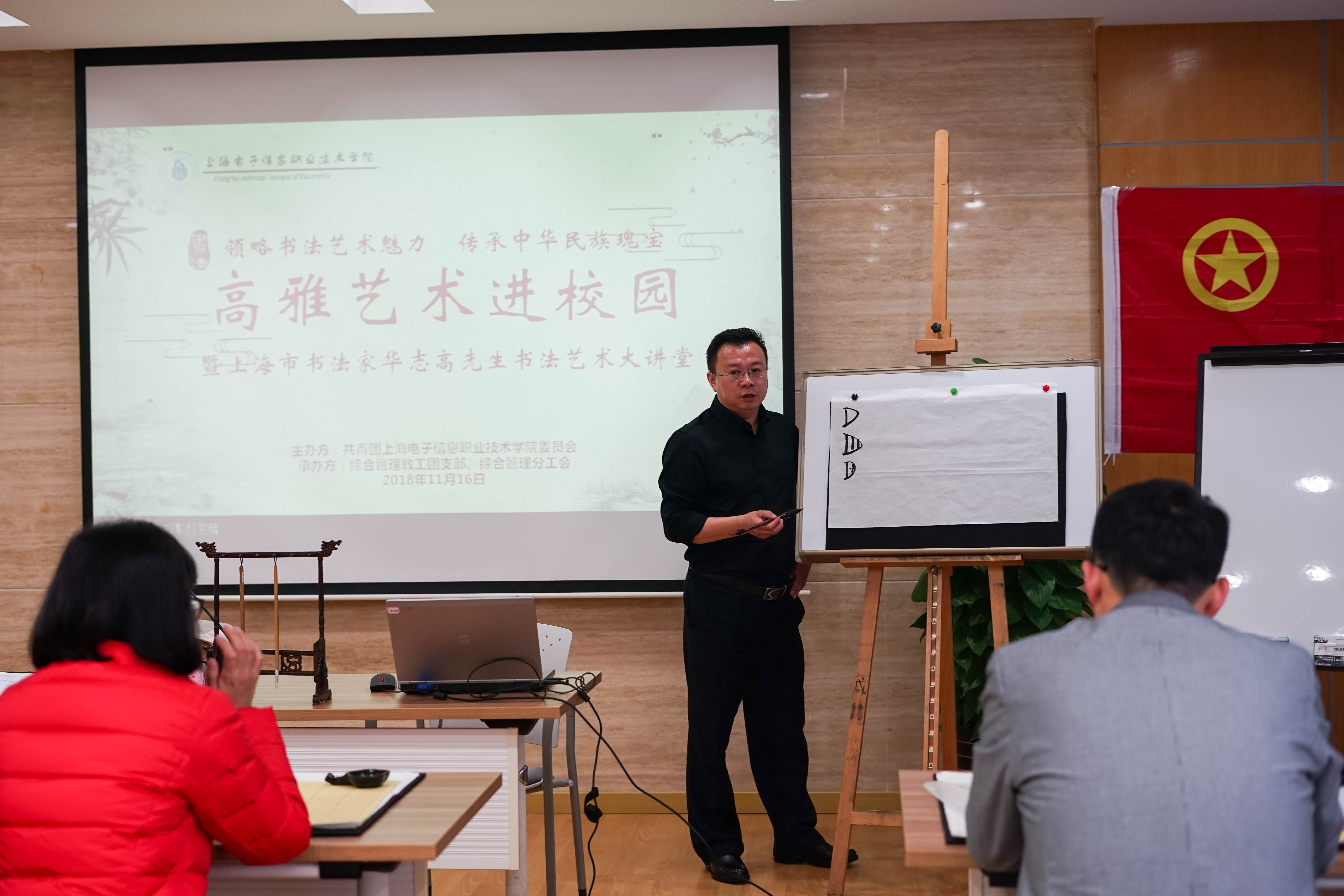 为贯彻中共中央、国务院《关于全面深化新时代教师队伍建设改革的意见》文件精神,落实全国教育大会精神,弘扬社会主义核心价值观和中华优秀传统文化,加强广大教工教学基本功训练和师德师风建设,提升教师的文字功底和综合素质。11月16日下午,由学校团委主办,综合管理教工团支部、综合管理分工会联合承办的“夯实教师基本功,传承中华传统文化” 青年教工主题团日活动在A207顺利举办。活动当天,学校团委特邀请到书法家、上海市书法家协会会员、上海青年书法家协会会员华志高先生给学校教职工带来了“夯实教师基本功,传承中华传统文化”书法艺术大讲堂。学校分管副校长张涛、团委、各教工团支部青年教师代表及学校书法社学生代表共同参加了此次活动。