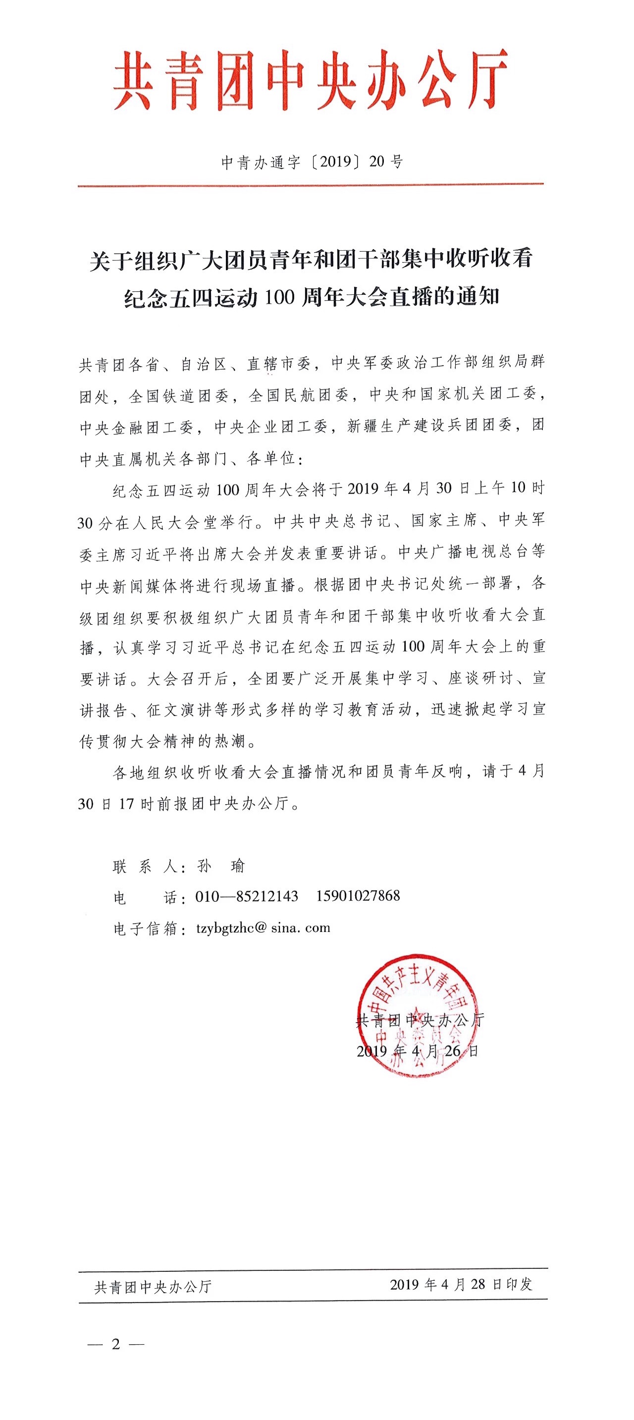 共青团中央办公厅印发《关于组织广大团员青年和团干部集中收听收看纪念五四运动100周年大会直播的通知》。通知要求,各级团组织要积极组织广大团员青年和团干部集中收听收看大会直播,认真学习习近平总书记在纪念五四运动100周年大会上的重要讲话。大会召开后,全团要广泛开展集中学习、座谈研讨、宣讲报告、征文演讲等形式多样的学习教育活动,迅速掀起学习宣传贯彻大会精神的热潮。