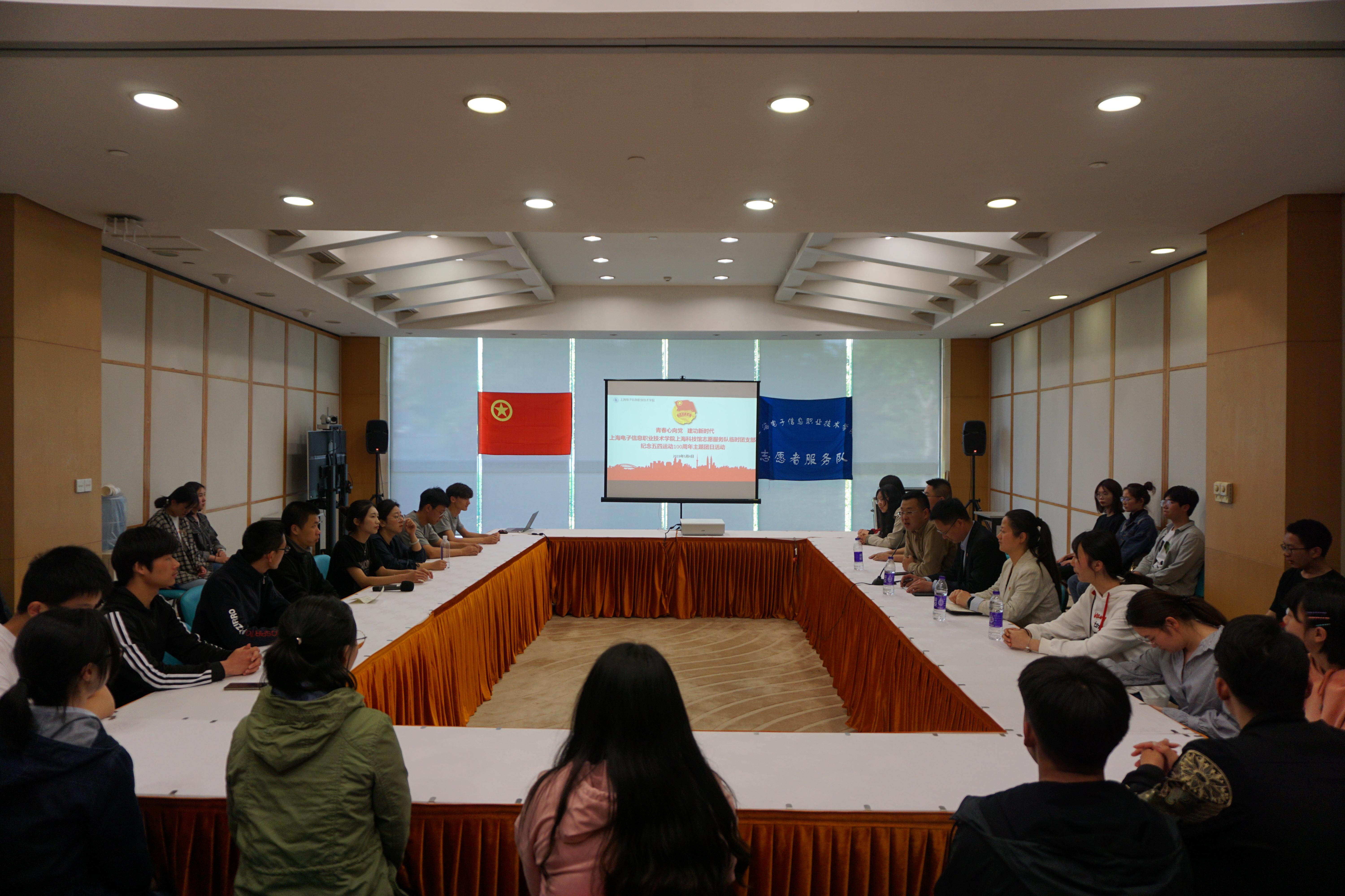 2019年5月2日至5日,学校团委组织30余名志愿者赴上海科技馆开展志愿服务活动并开展了以“青春心向党 建功新时代”为主题的上海科技馆、自然博物馆临时团支部纪念五四运动100周年主题团日活动。首先,学校党委副书记、副院长张涛在学校团委书记蔡林洁老师的陪同下依依走访奋战在科技馆志愿服务一线的我校青年志愿者们,并代表学校党委向志愿者们送去五四青年节的祝福。志愿者完成一天的志愿工作后,来到会议室,纪念五四运动100周年主题团日活动在与会人员齐唱团歌声中拉开帷幕。会上,志愿者们深入学习习近平总书记在纪念五四运动100周年大会上的重要讲话精神并发表感想,张涛副书记听了志愿者们的交流发言后,对与会志愿者的学习体会表示肯定,为志愿者对科技馆的奉献表示赞扬。