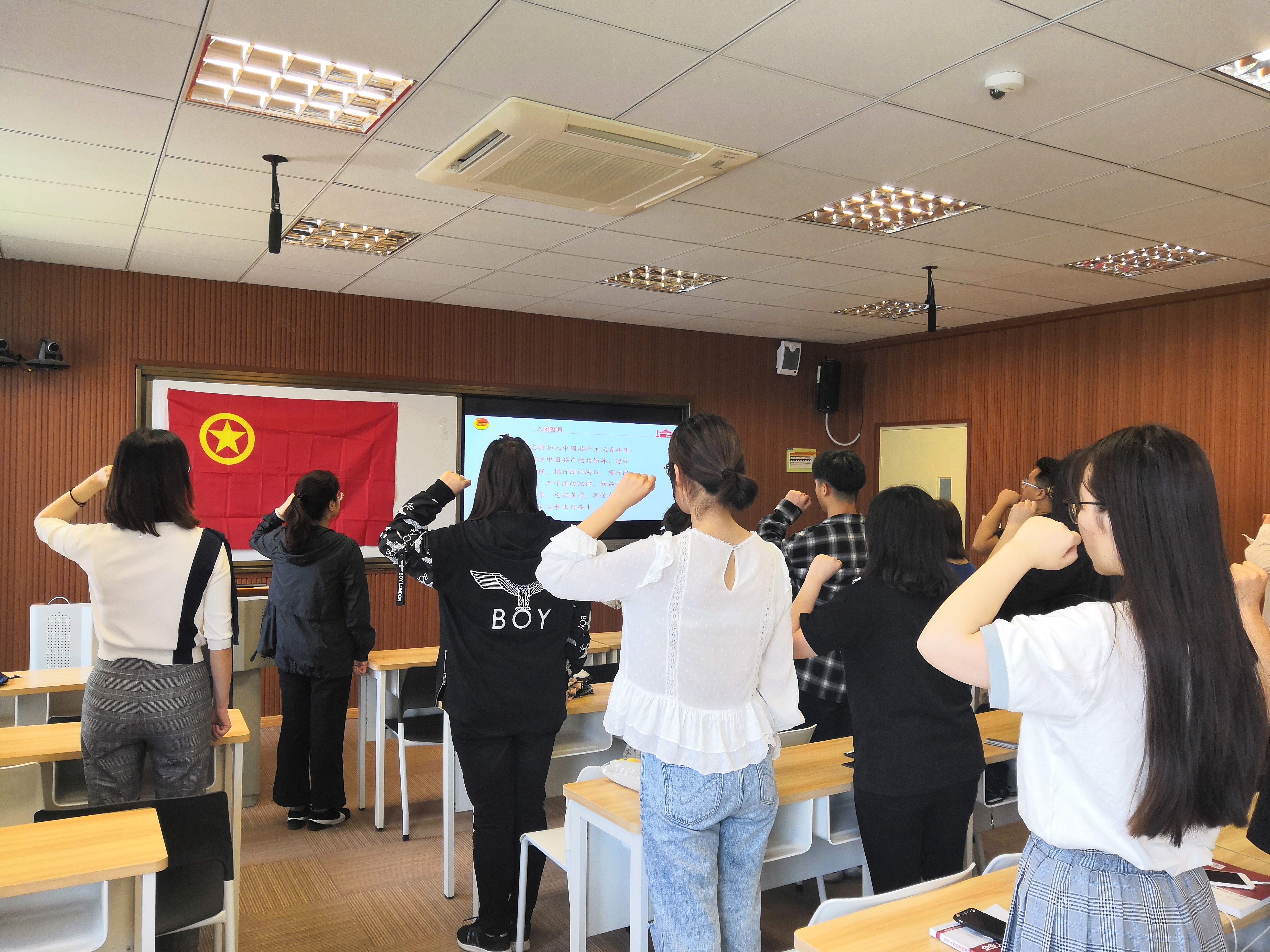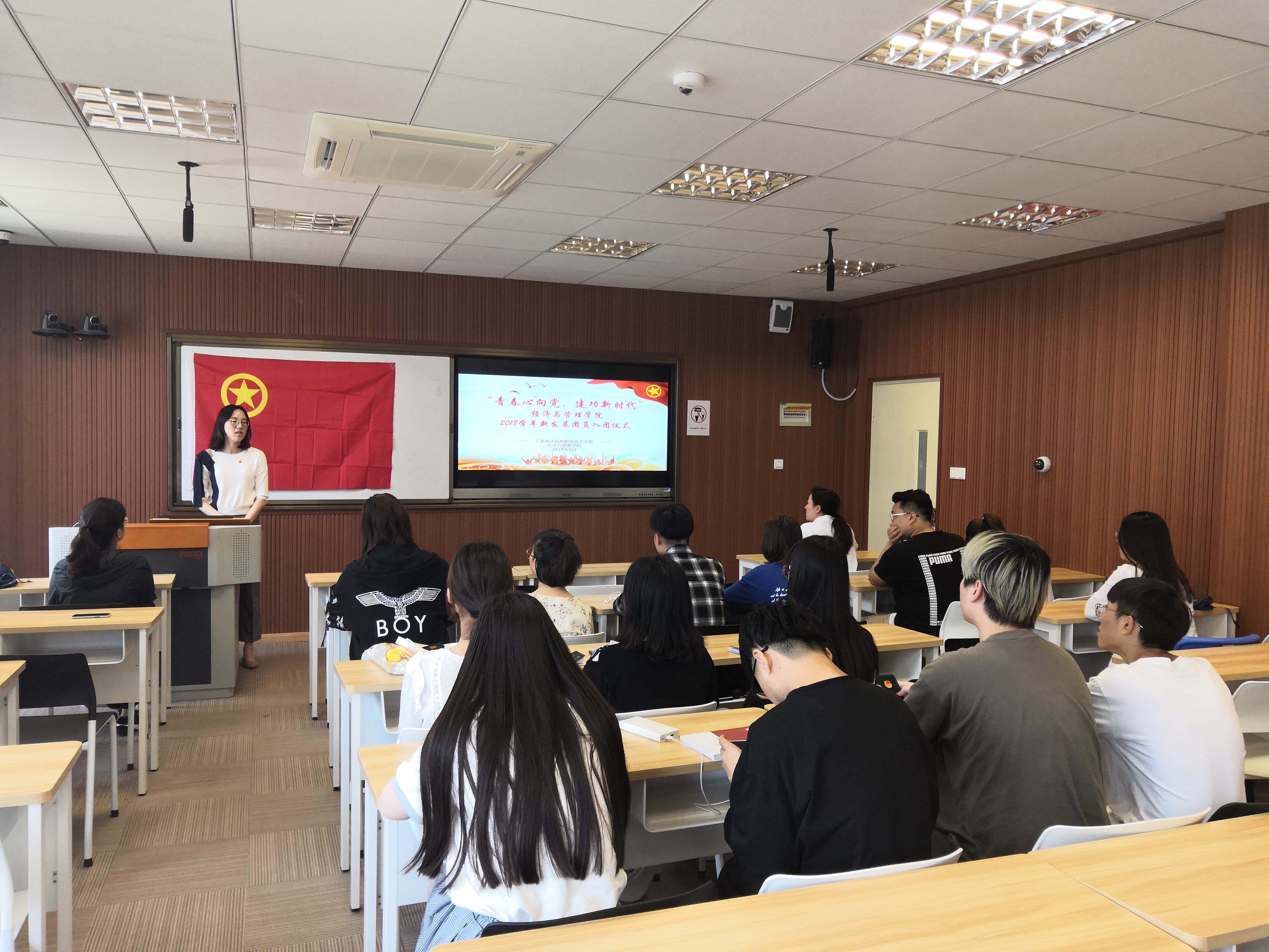 2019年5月21日中午12时20分,经济与管理学院团总支召集十五名新晋团员在H310教室召开了“青春心向党,建功新时代”2018年新发展团员入团仪式。首先,全体奏唱团歌;紧接着并由经济与管理学院团总支王永康老师宣读了十五名新晋团员名单并为每一位新团员颁发团员证、佩戴团徽;最后,团总支柴巍作为领誓人与十五名新晋团员面向团旗,右手握拳,在团旗下坚定地宣誓。通过此次活动让新一批团员通过入团仪式明确作为一名合格团员在今后学习生活中所担负的责任和使命,感受共青团带来的光荣,团组织带来的力量。