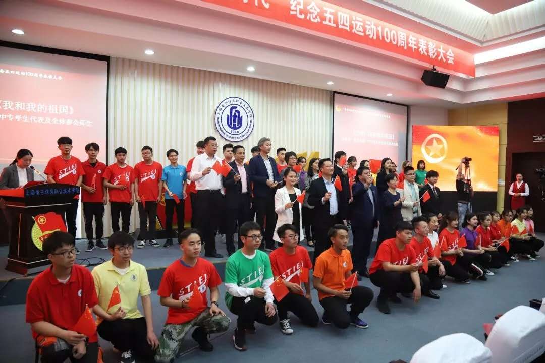 2019年5月10日,上海电子信息职业技术学院纪念五四运动100周年表彰大会和青年主题集会在奉贤校区C108报告厅和B楼广场隆重举行。首先,全场师生跟随大屏幕共同回顾了各级团学组织2018年来团学工作的瞬间。随后,学校党委副书记、副校长张涛致辞。张涛副书记向青年们提出了三点期望:一是要坚守初心,坚定步伐;二是要锤炼工匠精神,不断开拓奋进;三是要迎难而上,敢于挑战。大会中,校团委书记蔡林洁宣读评优表彰决定、宣读基层团干部技能比武大赛表彰决定。然后,学校党委书记田钦对青年们提出了殷切的希望,为青年们指明了奋斗的方向,对共青团提出了明确的要求,以青春之智慧、青春之力量,建设青春之校园,开拓青春之局面。随后,一首诗朗诵《五四一百年》表达我校青年学子时刻追溯先人,时刻追随五四精神。最后,大会在慷慨激昂的师生大合唱《我和我的祖国》中落下帷幕,不仅唱出了新时代青年们的爱国之情,同时也唱出了青年们的民族骄傲和自豪。