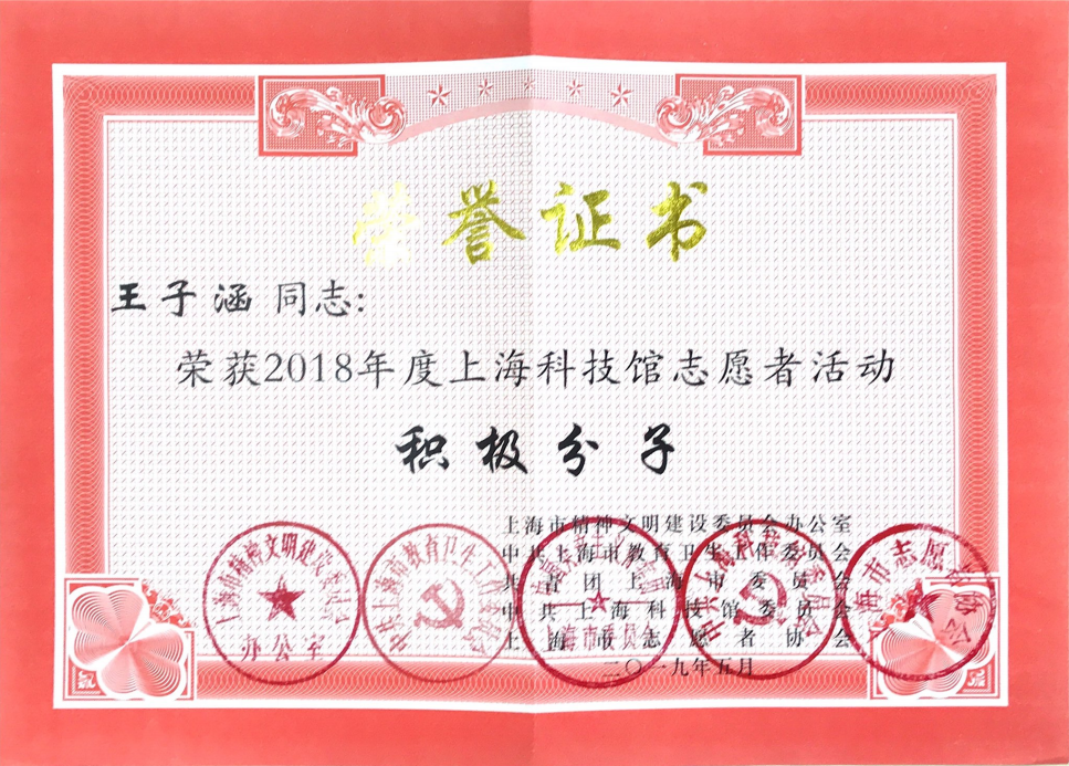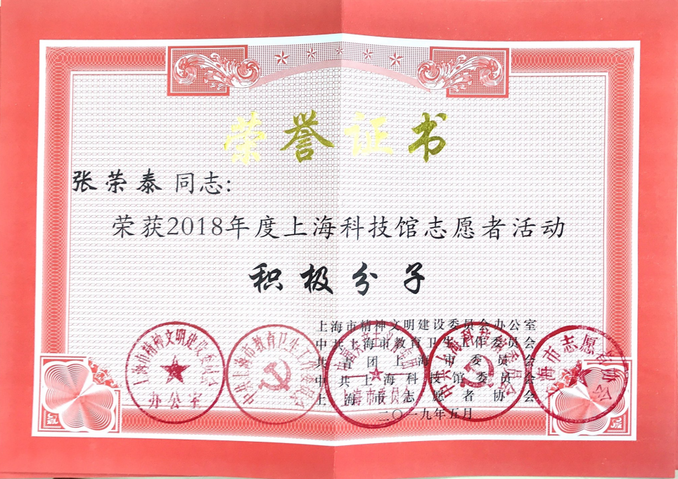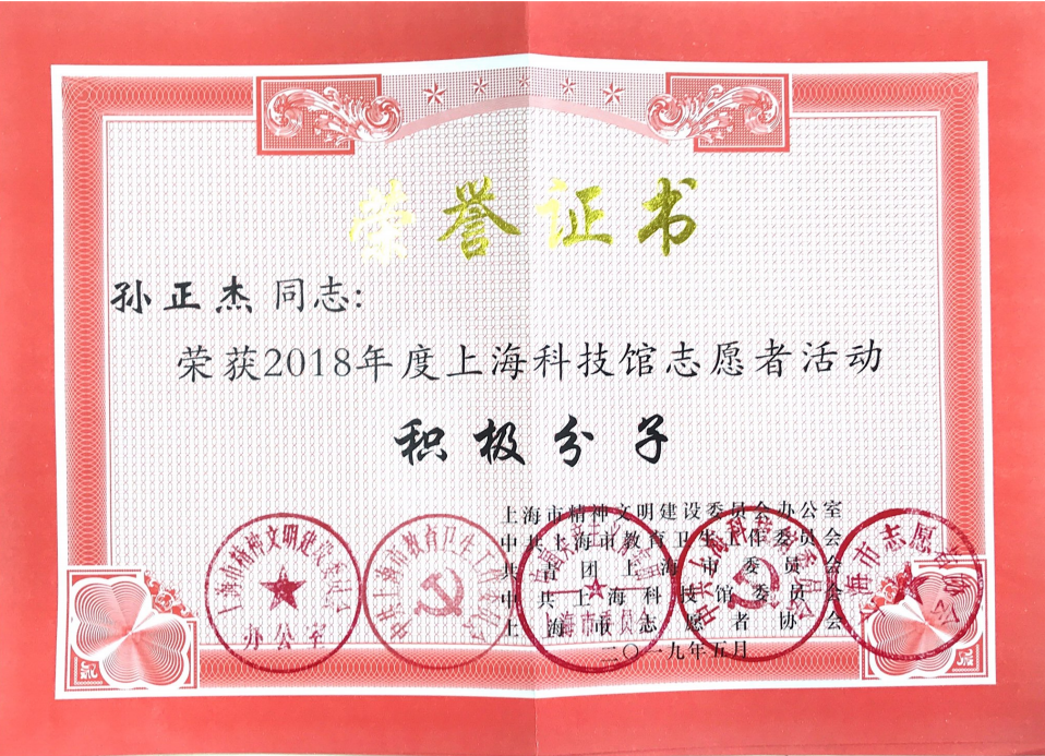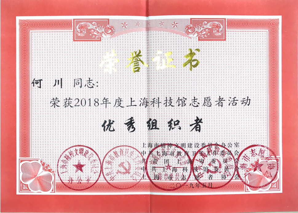 5月29日,“志愿建功新时代 砥砺奋进新征程”2019年上海科技馆志愿者表彰会在上海科技馆报告厅举行,我校通信与信息工程学院2016级孙正杰同学、2017级王子涵同学、机械与能源工程学院2015级张荣泰同学荣获2018年度上海科技馆志愿者活动“积极分子”光荣称号;何川老师荣获2018年度上海科技馆志愿者活动“优秀组织者”光荣称号;我校志愿者服务总队荣获2018年度上海科技馆志愿者活动“表扬集体”光荣称号。