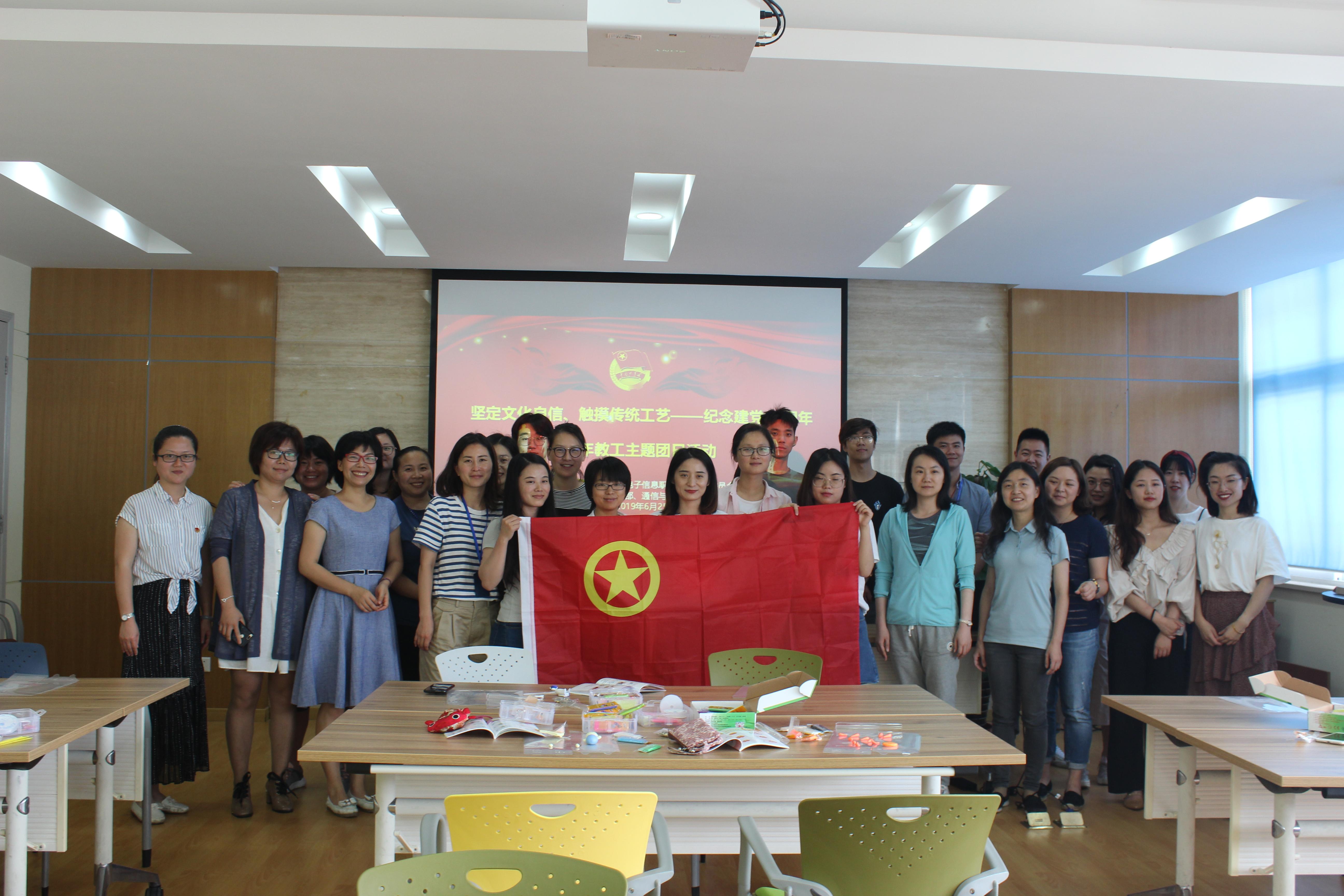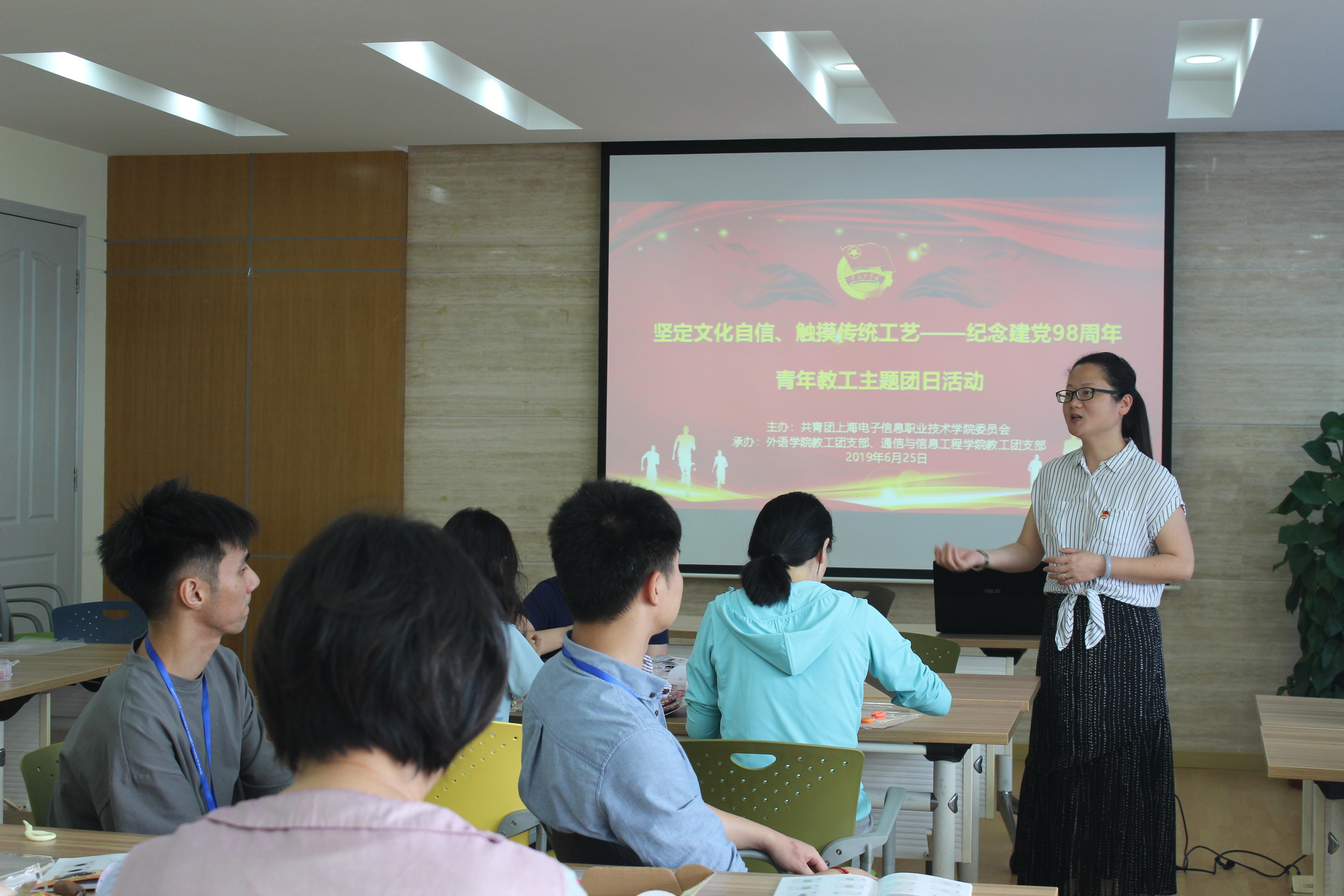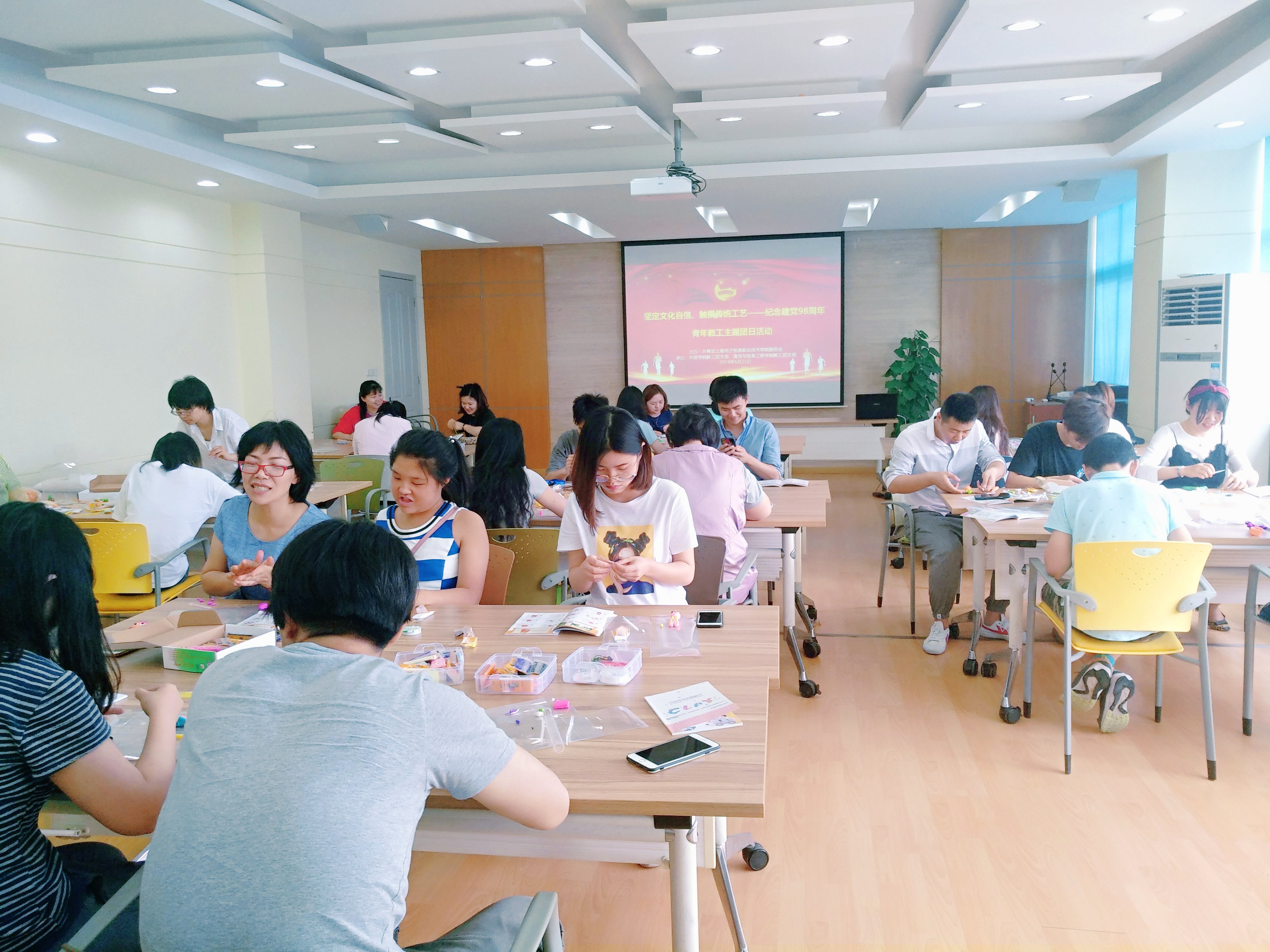 为深入学习贯彻习近平新时代中国特色社会主义思想和党的十九大精神,弘扬中华民族传统文化,让青年教工感受更多中国传统民间技艺,坚定“四个自信”,增强共青团组织的凝聚力和吸引力。让青年教工在接触传统经典工艺过程中,能够悉心沉淀、回望初衷,牢记使命,从而进一步推动“立德树人”、“三圈三全十育人”工作开展。6月25日中午12:00,校团委在A207举行“坚定文化自信、触摸传统工艺——纪念建党98周年”青年教工主题团日活动。本次活动由校团委主办,外语学院教工团支部和通信与信息工程学院教工团支部承办,各教工团支部青年教师代表共同参加了此次活动。