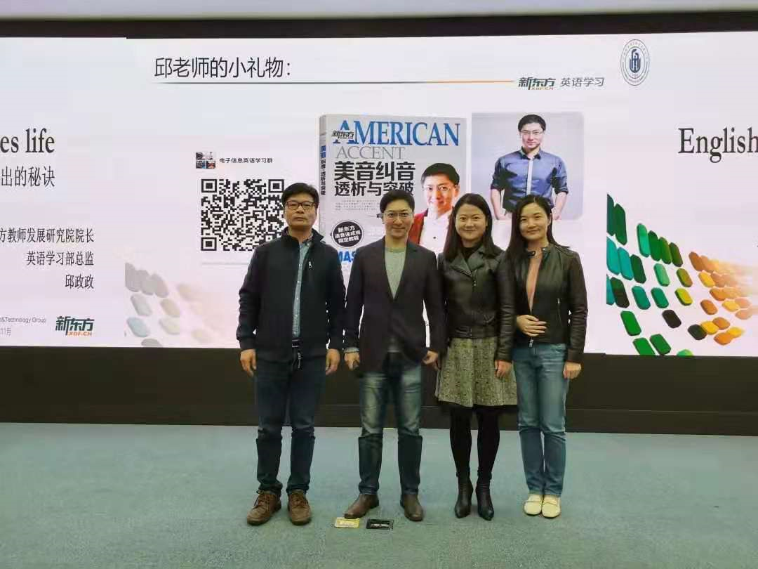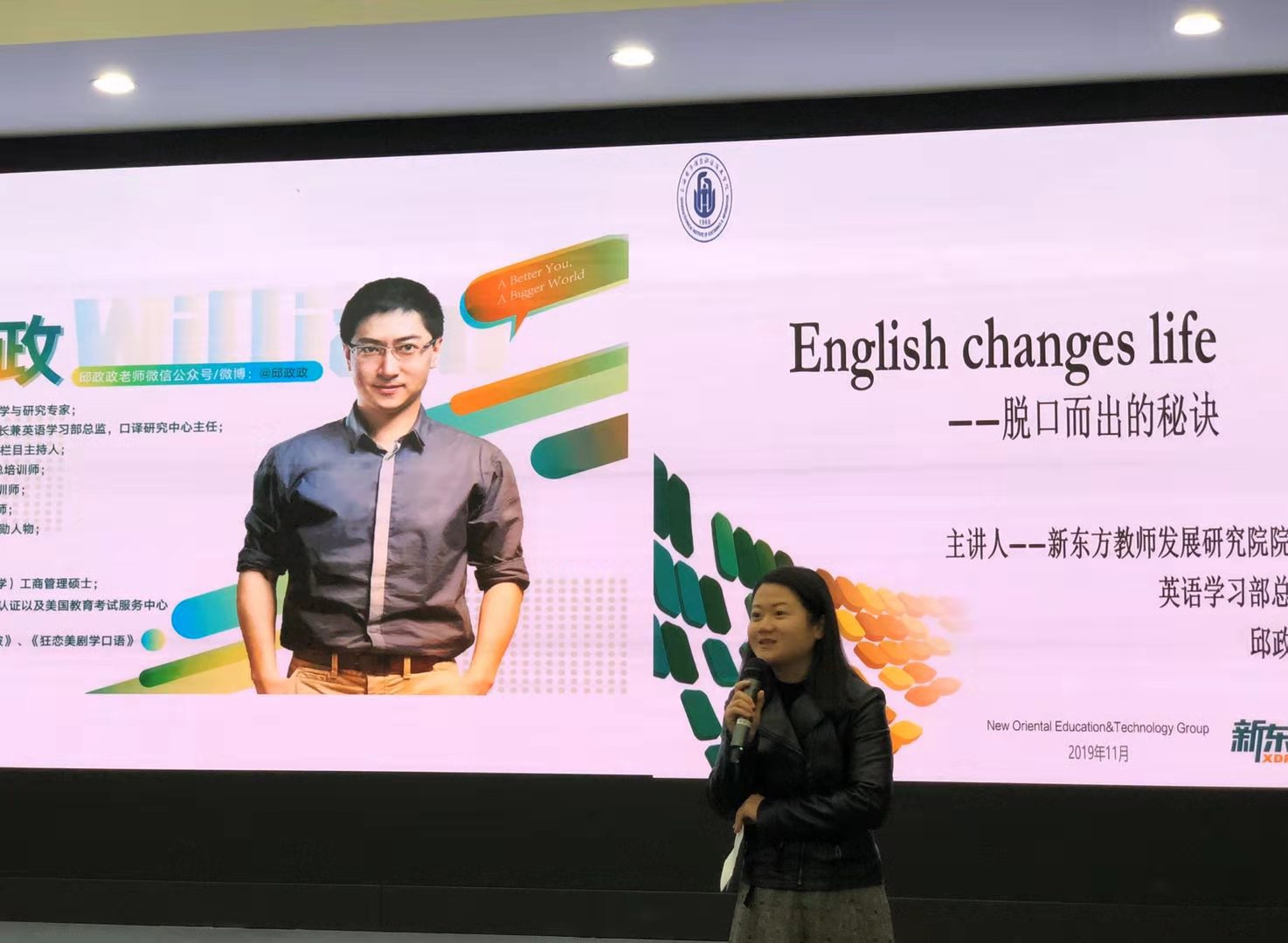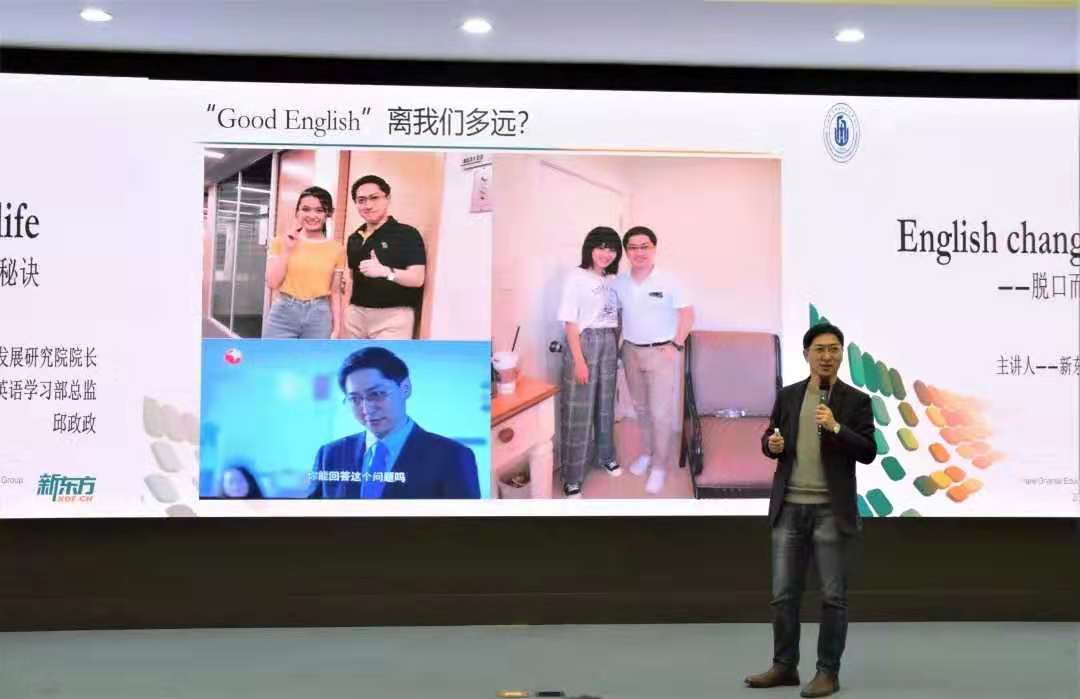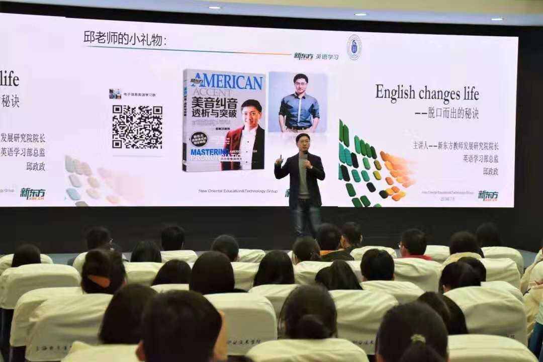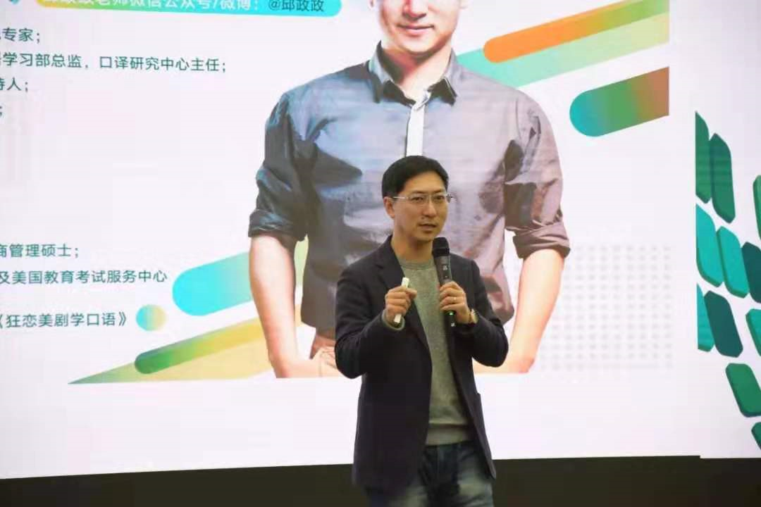 为进一步推动我校学生英文水平均衡发展,真正将英语学科素养理念落实到地,根据我校图书馆工作安排,结合一线教师与学生们的需求,新东方(上海)教师发展研究院院长,英语学习部总监,教学管理中心主任,口译研究中心主任,新东方集团20周年功勋人物邱政政于11月26日晚莅临我校C108报告厅,开设专题讲座《脱口而出讲英文》为我校学子奉上了一场精彩绝伦的演讲。