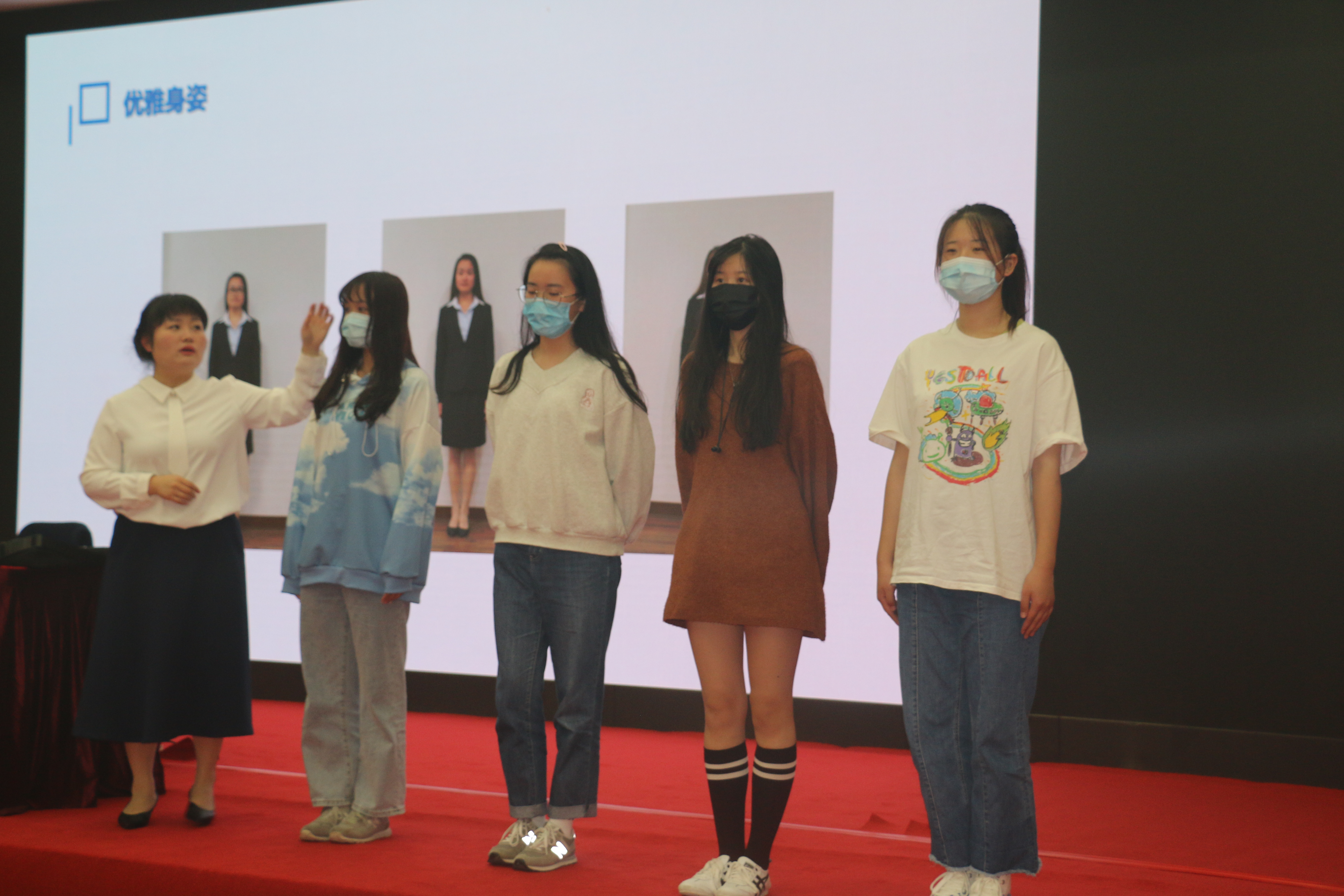 陈老师首先就礼仪概论展开本次培训课程。旨在培养我校“小叶子”良好的礼仪素质和职业规范,促进我校“小叶子”在进博会的学习和工作中塑造良好的自身形象及规范的礼仪动作。紧接着陈老师围绕“小叶子”的外貌、精神状态、言行举止等多方面施展教学,引经据典,耐心且细致地讲解学习要点,进而帮助大家更好的学习形象塑造。最后陈老师就“小叶子”工作中可能遇到的突发状况进行针对性教学,教导大家如何处变不惊、优雅从容的应对突发问题,更好的展现我校“小叶子”的蓬勃朝气。