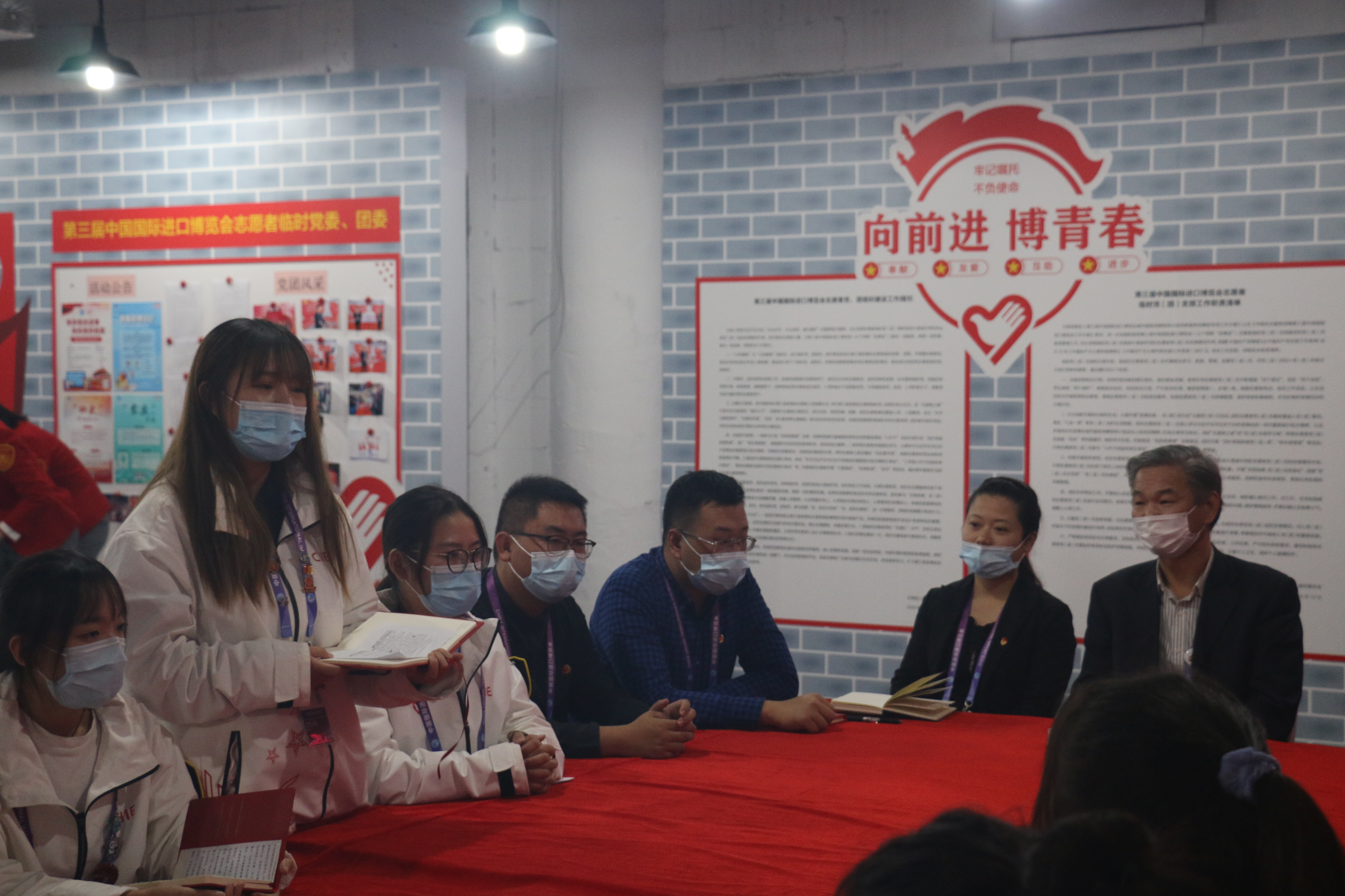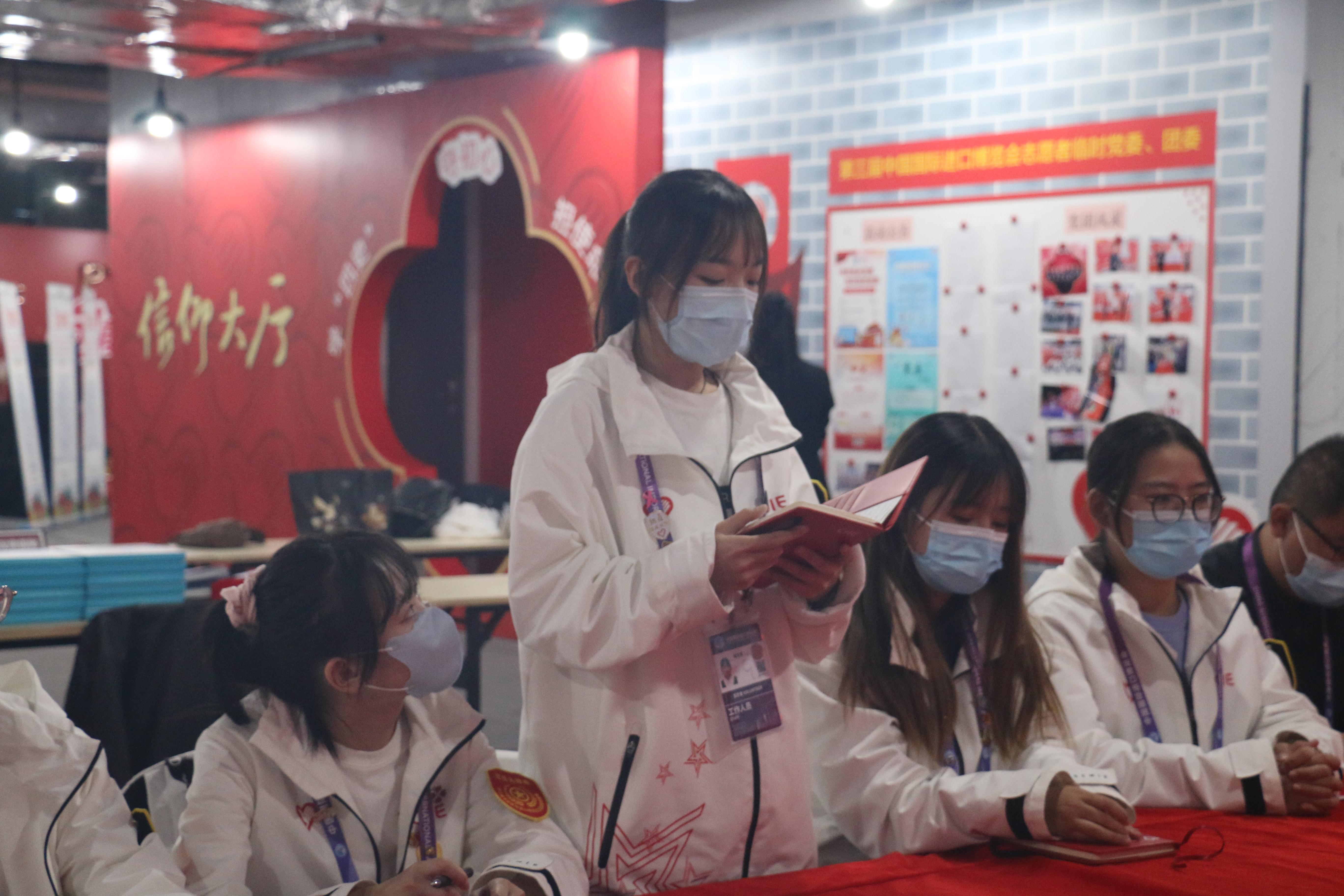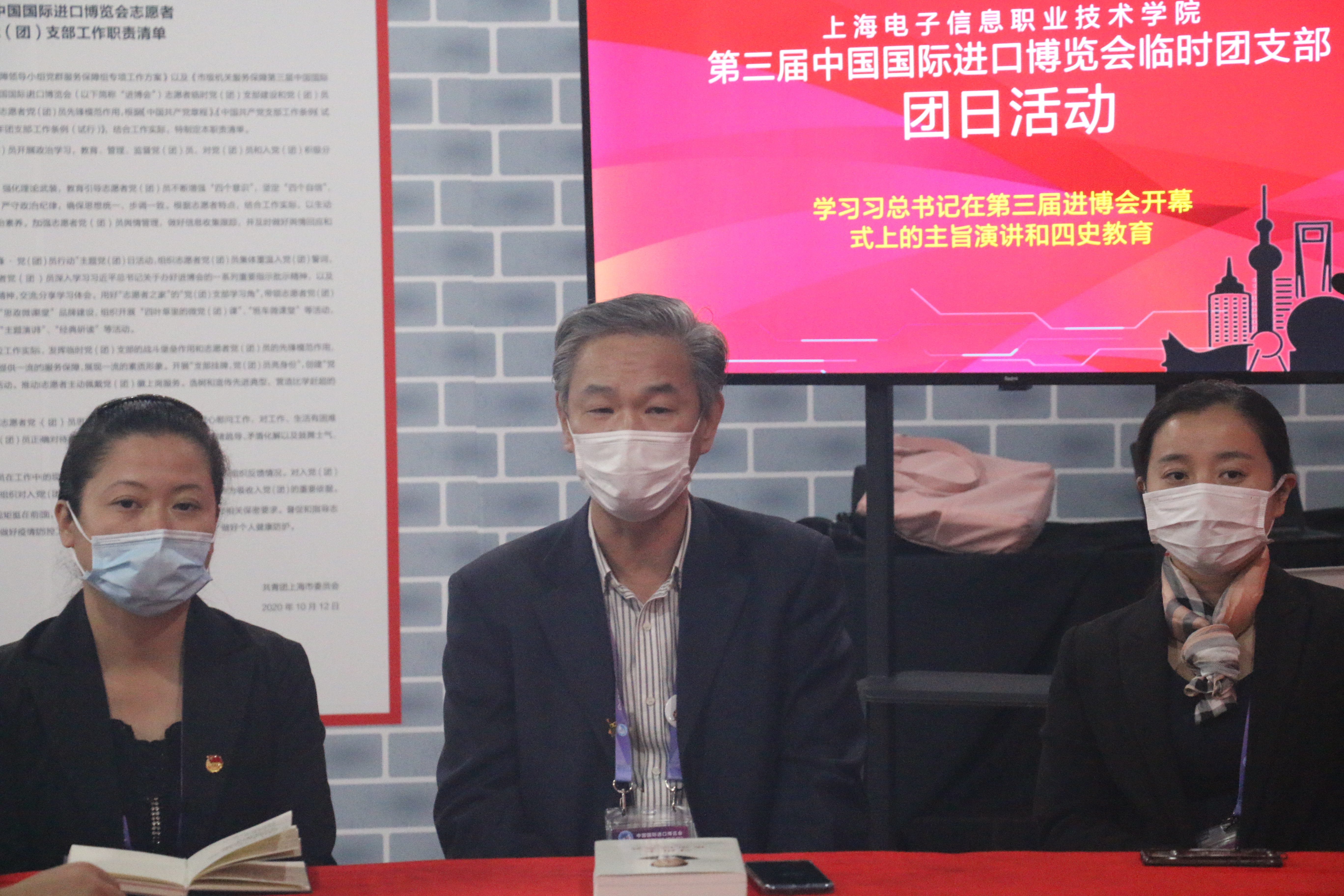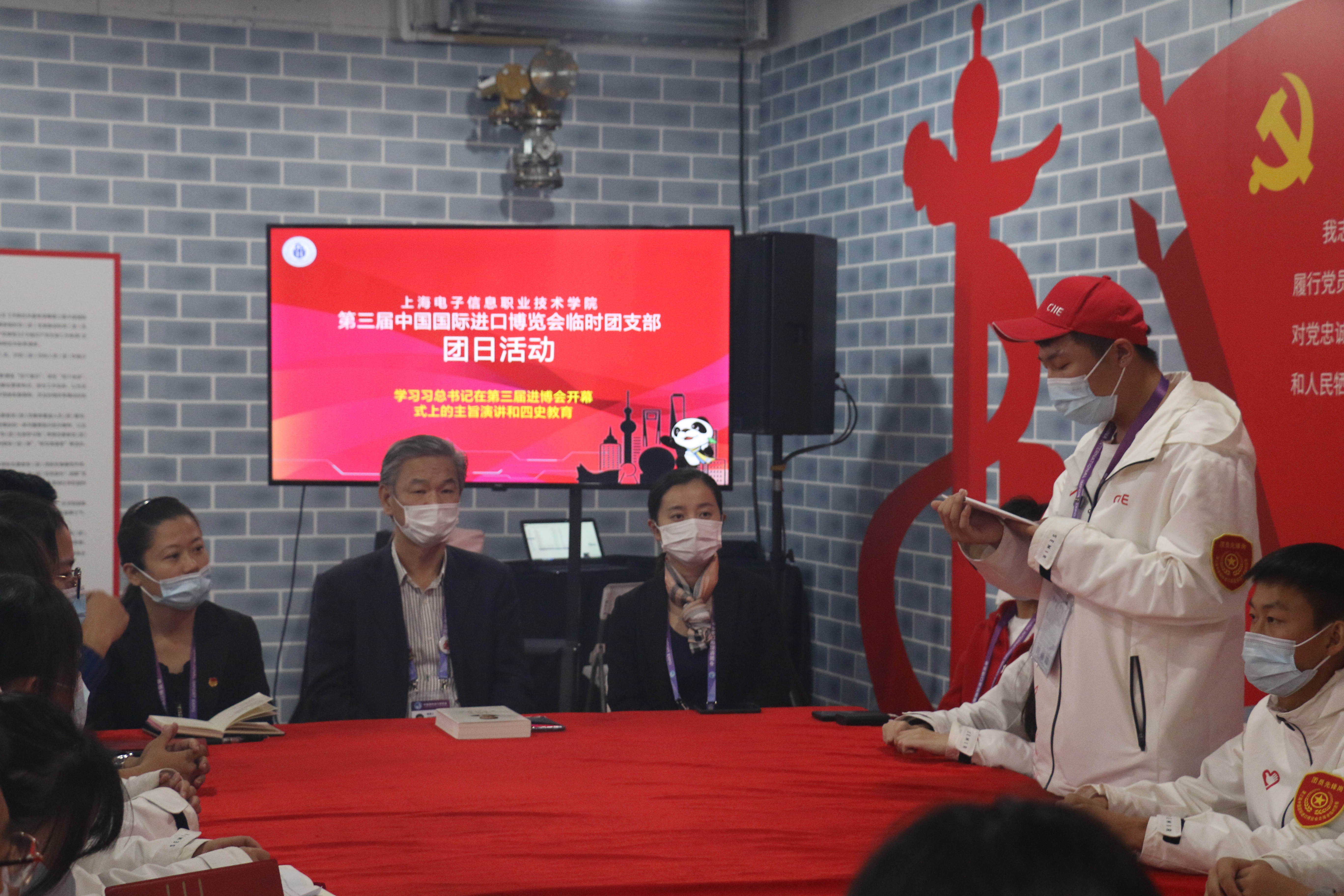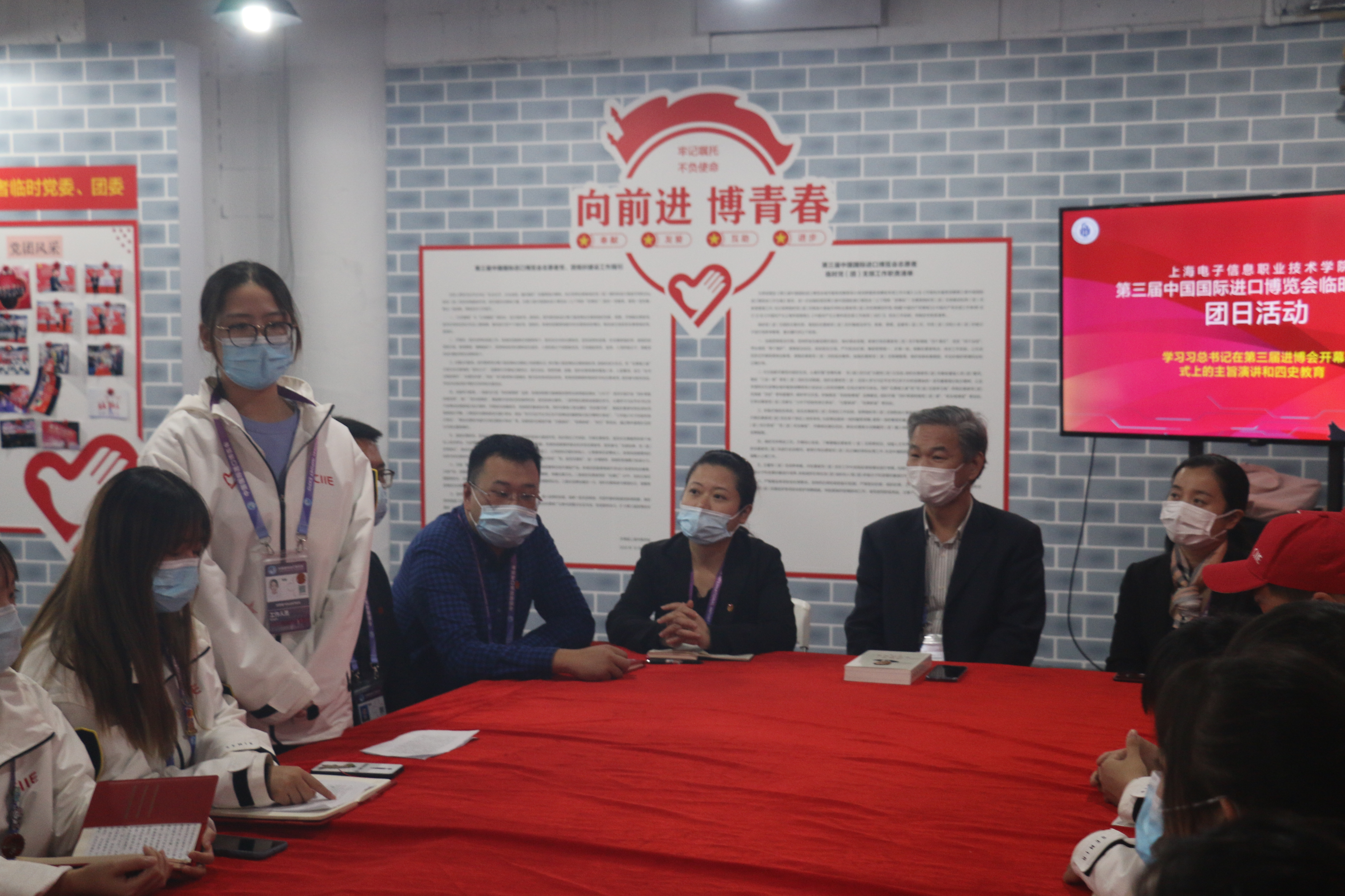 11月8日中午,上海电子信息职业技术学院第三届中国国际进口博览会临时团支部在国际会展中心(上海)志愿者之家信仰大厅召开了第二次主题团日活动,外语学院直属党支部书记吴亚人,设计与艺术学院直属党支部书记高晓昧,校团委书记蔡林洁以及部分“小叶子”参与此次活动,活动由校团委副书记何川主持。