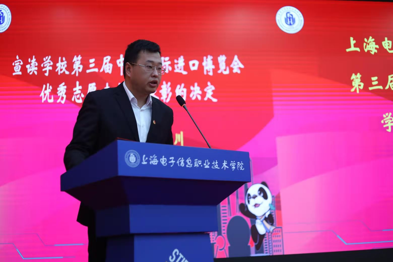 2020年12月3日中午,我校在中德楼C108报告厅召开第三届中国国际进口博览会学生志愿者表彰大会。学校党政领导班子、各二级学院党总支书记、分管学生工作党总支副书记、校团委、团总支书记、负责人以及所有“STIEI小叶子们”出席本次大会。大会由学校团委书记蔡林洁主持。