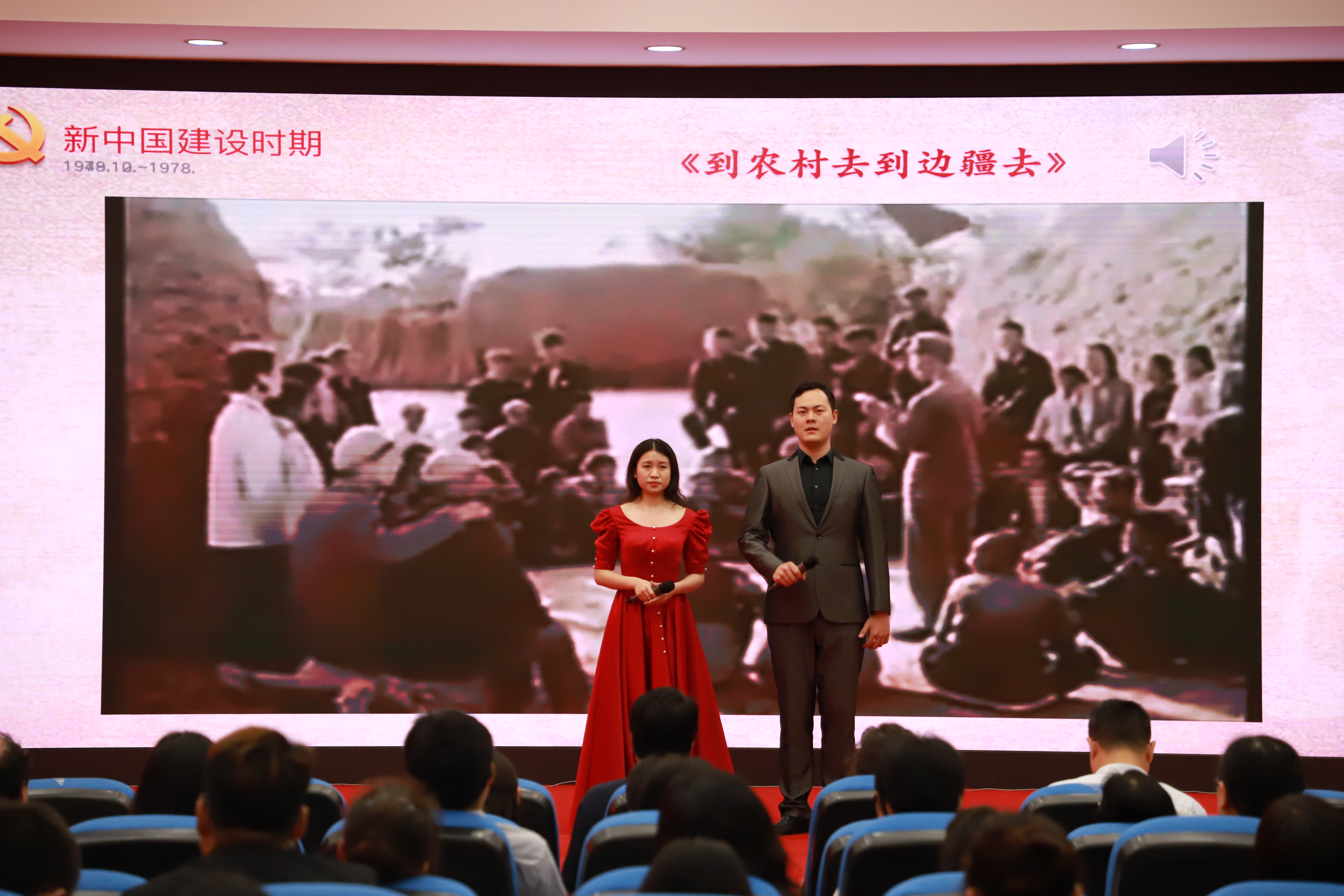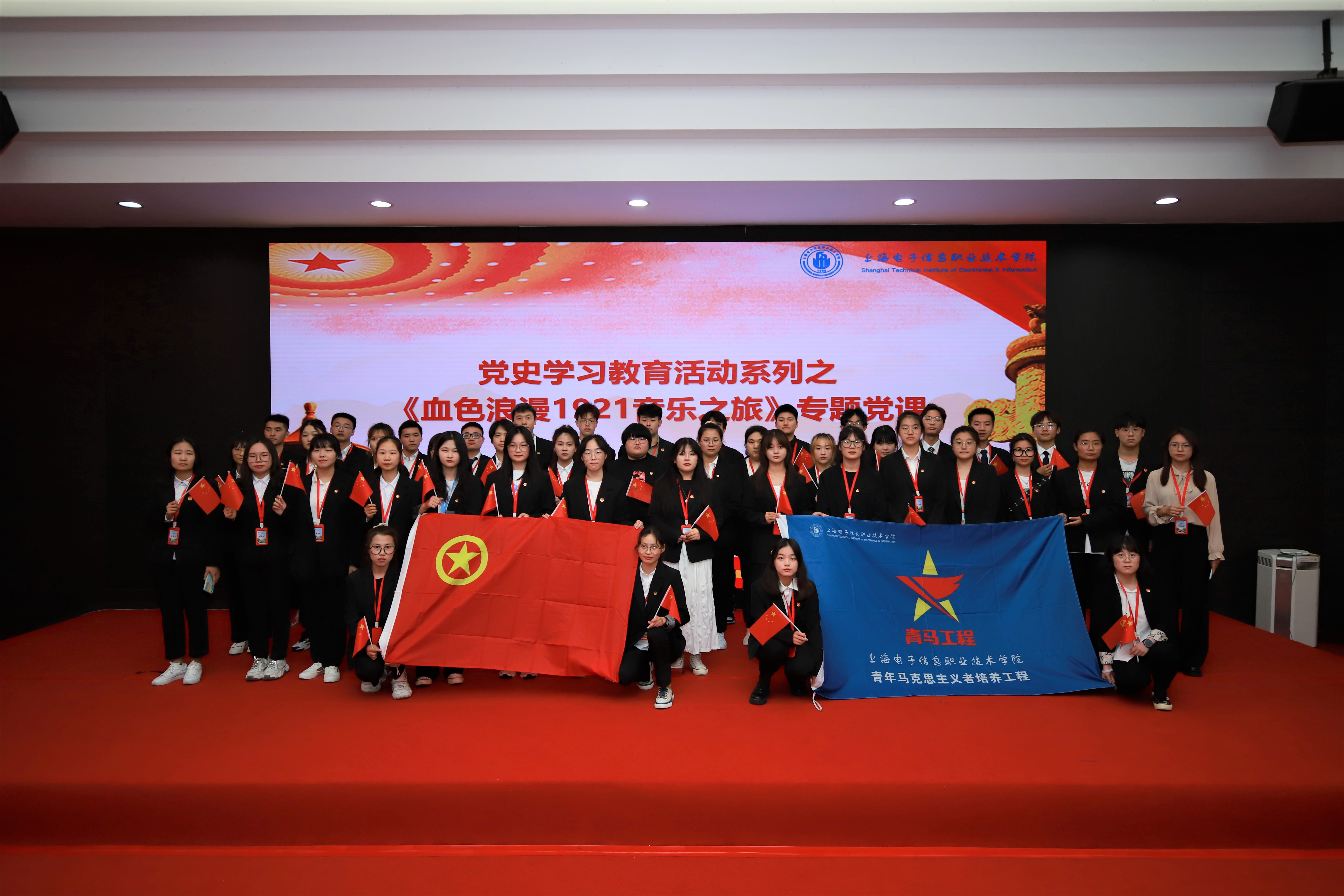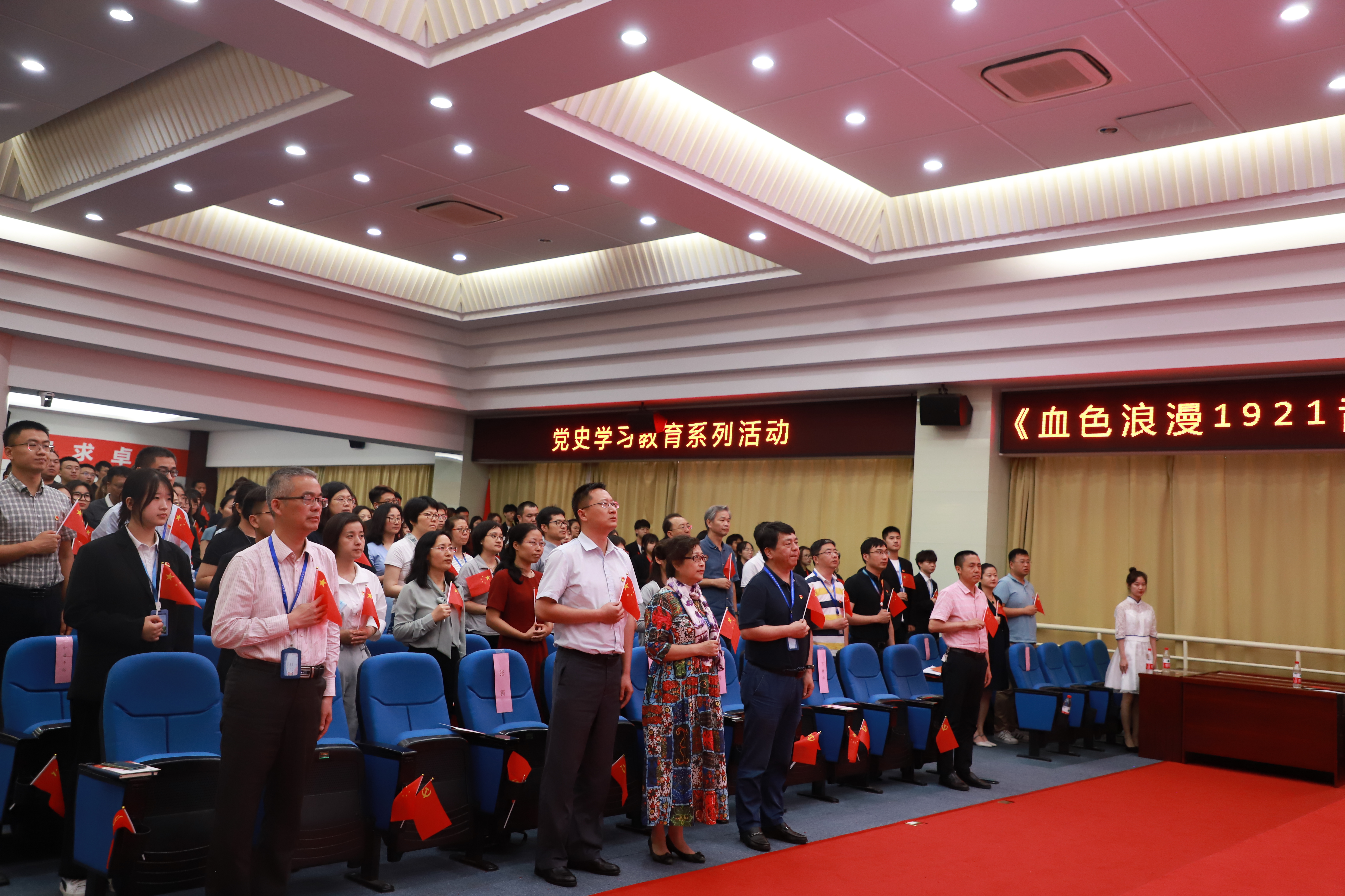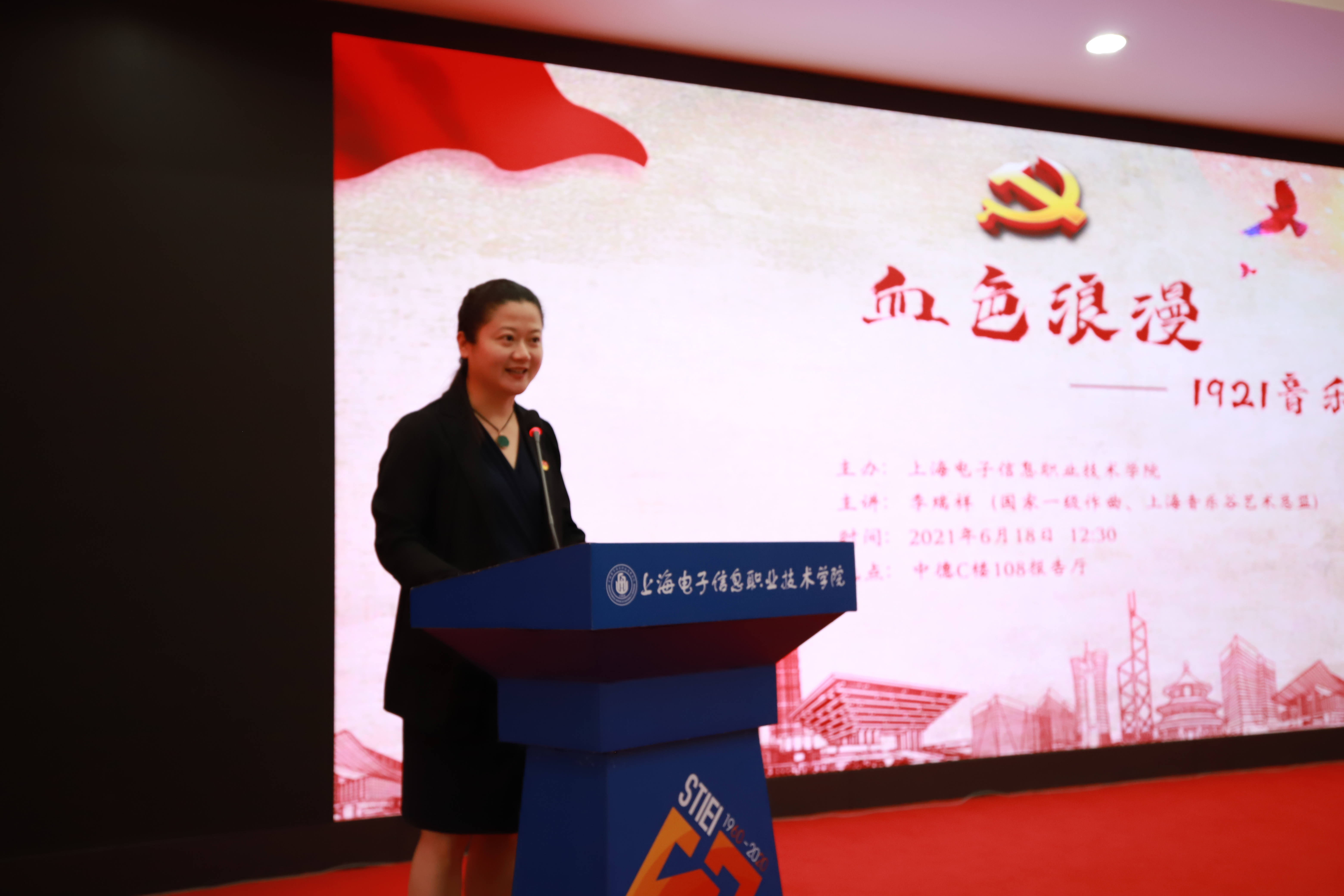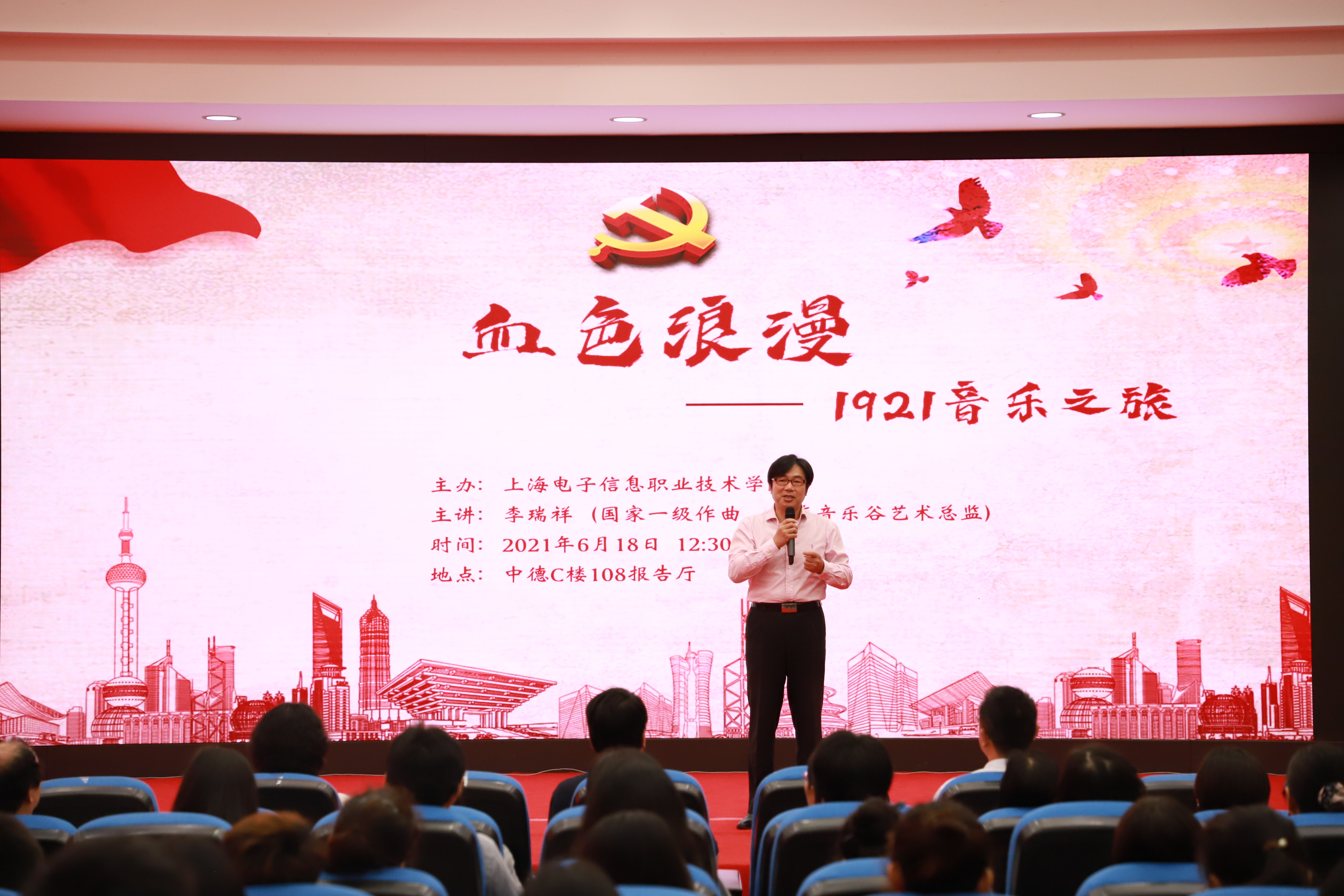 为庆祝中国共产党成立100周年,深入贯彻落实习近平总书记在党史学习教育动员大会上的重要讲话精神,追忆党的百年荣光。2021年6月18日12点30分在c108举行《血色浪漫1921音乐之旅》专题党课,学校党政领导班子、学校原党委副书记,校长杨秀英、全体中层干部、党员代表以及学校第二十期青马工程学员出席本次党课,党课由团委书记蔡林洁主持。