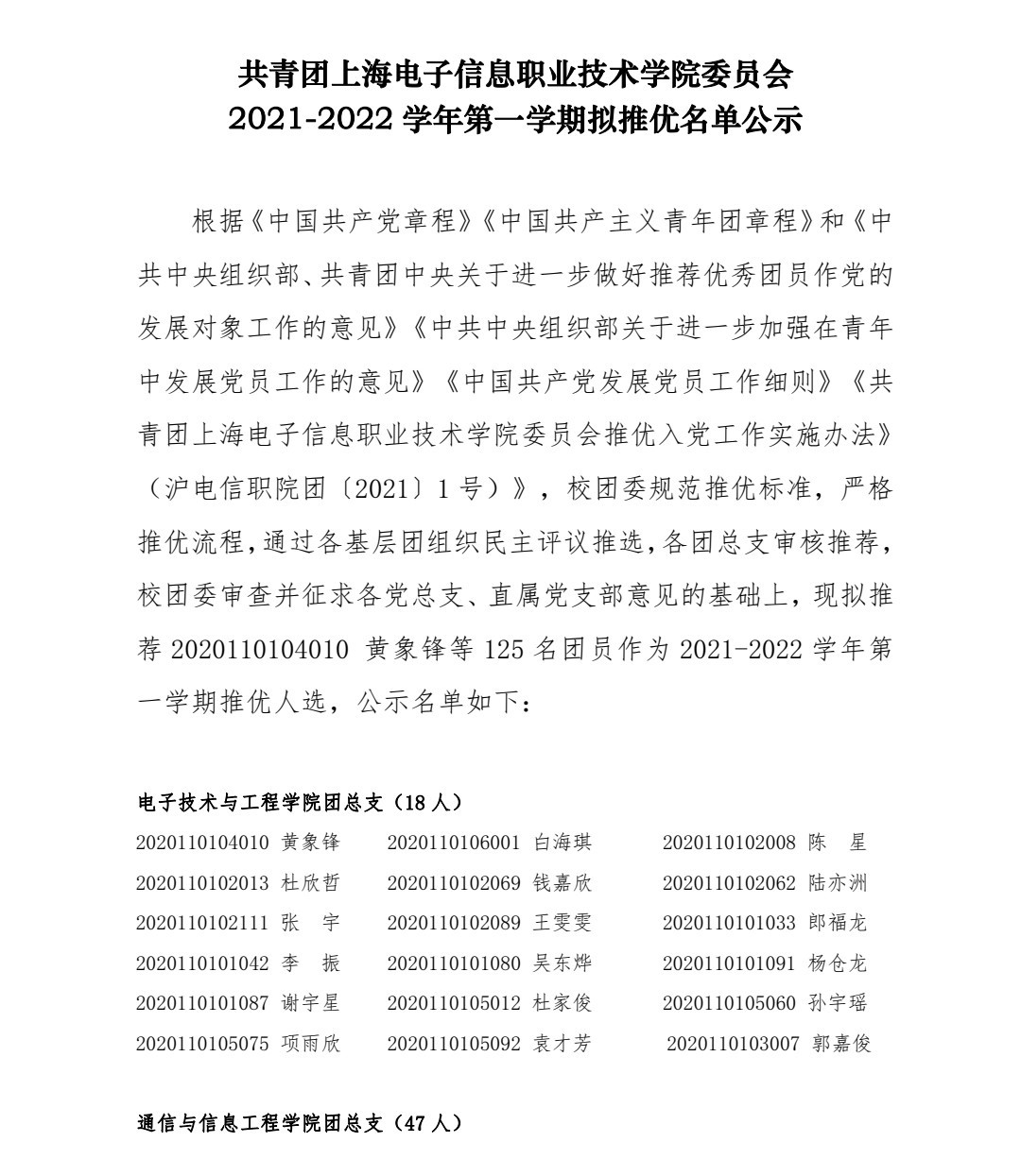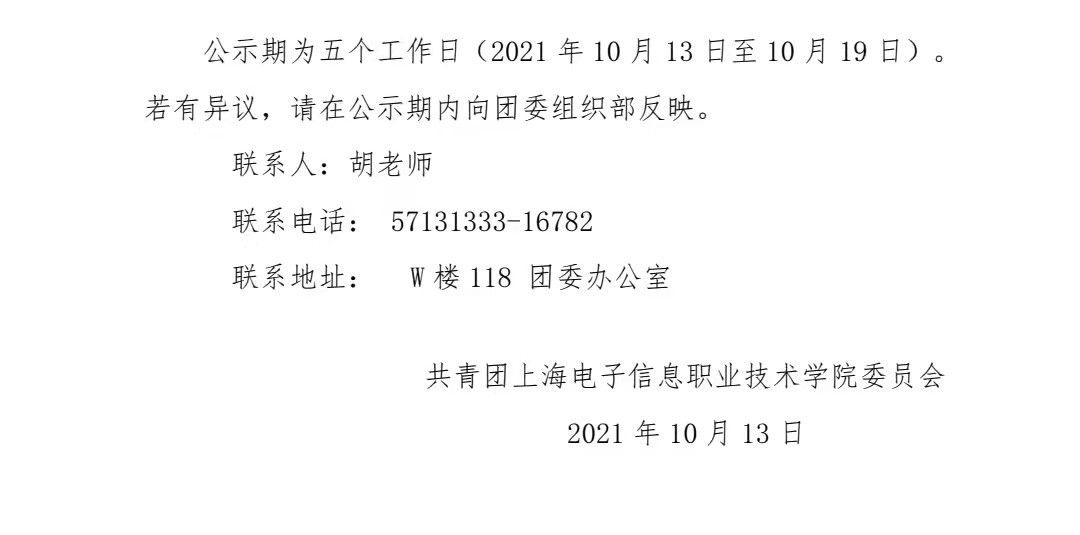 共青团上海电子信息职业技术学院委员会2021-2022 学年第一学期拟推优名单公示