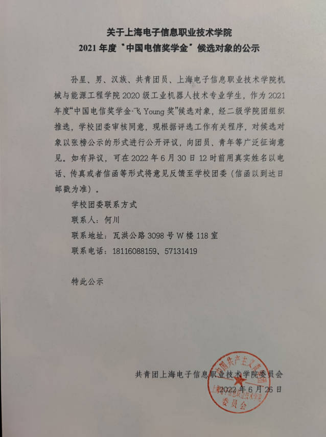 2021年度“中国电信奖学金”候选对象的公示