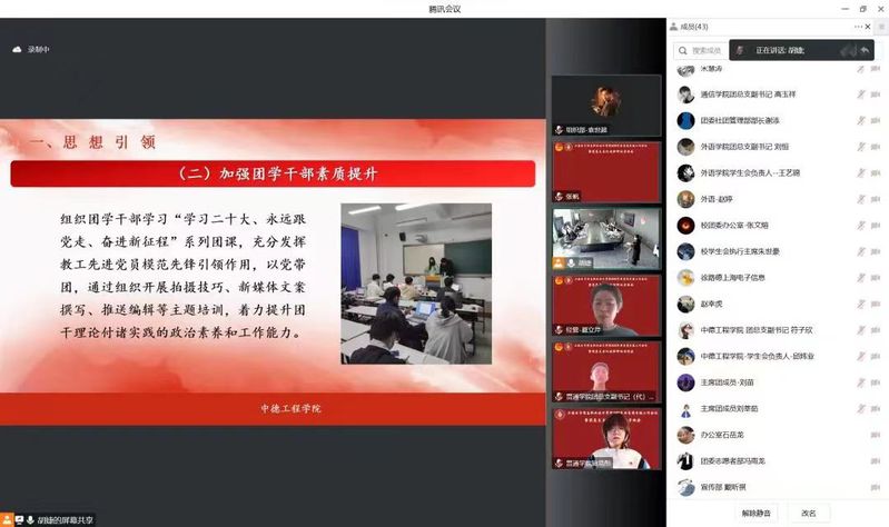 首先,由各二级学院团总支依次进行述职。团总支书记述职结合《上海电子信息职业技术学院共青团2022年工作要点》,围绕上级党团组织明确的年度重点任务和本级团组织确定的年度工作目标,紧扣引领凝聚青年、组织动员青年、联系服务青年基本职责落实情况,对本级团组织履行职责和工作情况认真述职,客观总结成绩、查找存在问题、提出改进措施。