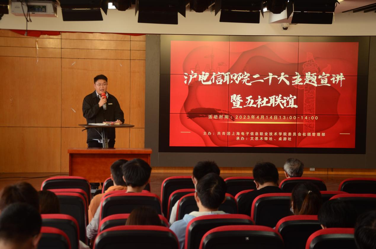 “珍惜韶华,奋发有为”,为深入学习宣传贯彻党的二十大精神,加强学生社团思想政治教育,4月14日,上海电子信息职业技术学院文思木铎社、桌游社邀请日新思辨社、翰轩棋社、静态模型社成员及我校38个学生社团骨干近200人在I401共同举行学习贯彻党的二十大精神主题宣讲暨社团联谊活动。