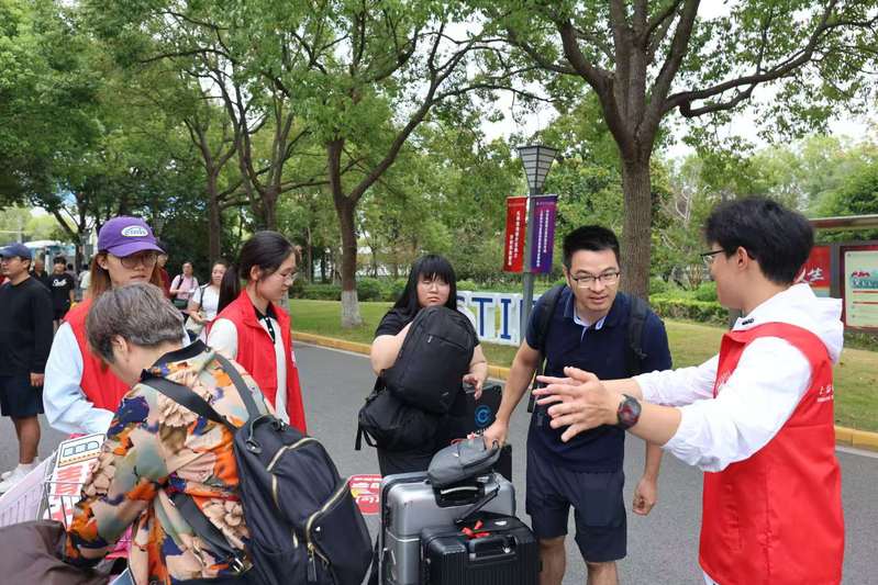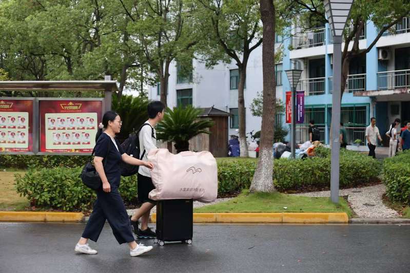 从外环路地铁站到校园,大巴车上坐满了携带行李的新生。红马甲志愿者,帮你把行李稳稳放在角落。窗外的雨慢慢小了,你们望着沿途掠过的校园建筑,有的悄悄拿出手机拍下实训楼的样子,一路的奔波,都化作了对未来的好奇。