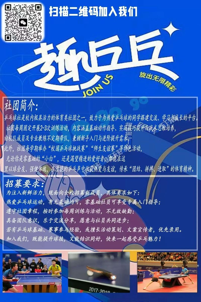 若有乒乓球基础、赛事参与经验,或擅长活动策划、文案宣传者,优先录用。加入我们,既能提升球技,又能结识同好,快来一起感受乒乓魅力!