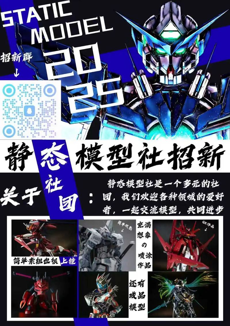 静态模型社是一个专注于拼装和涂装各类比例模型套件的社团。无论是军事装备(坦克、飞机、战舰)、科幻机甲,还是汽车、人物,我们追求的不是让模型能动起来,而是通过双手和耐心,在桌面上创造一个极尽还原、充满故事的微缩静态世界。简单来说,我们是一群用双手创造“完美微缩艺术品”的实践者。