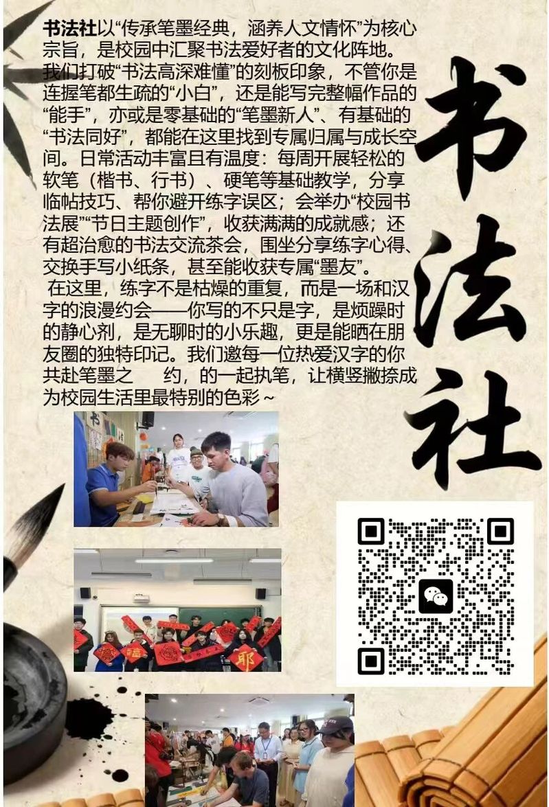 日常活动丰富且有温度:每周开展轻松的软笔(楷书、行书)、硬笔等基础教学,分享临帖技巧、帮你避开练字误区;会举办“校园书法展”“节日主题创作”,收获满满的成就感;还有超治愈的书法交流茶会,围坐分享练字心得、交换手写小纸条,甚至能收获专属“墨友”。