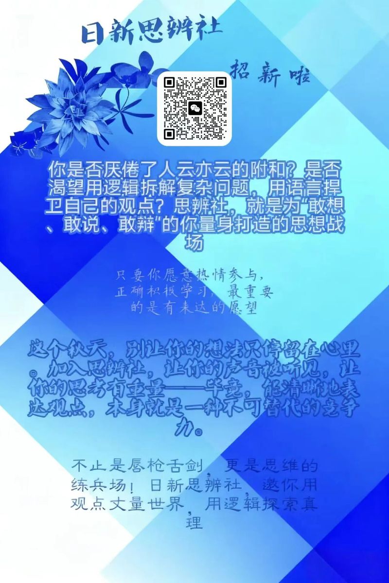 日新思辨社需你:有责任心,主动思考热点话题、能投入时间参与训练、有责任心、以开放心态面对观点分歧、有责任心、懂团队协作不搞“个人秀”。