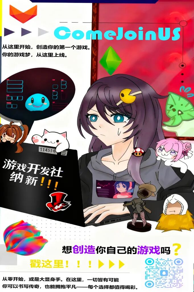 社团简介:在这里,我们既是玩家,也是创造者。游戏开发社是一个汇聚梦想与代码的工坊,我们打破游戏仅作为娱乐的界限,深入其背后的逻辑、艺术与情感。无论你钟情于编程构架世界,擅长绘画与音乐塑造灵魂,还是痴迷于叙事设计触动人心,这里都有你的一席之地。我们定期组织编程、建模、动画制作讲解,以及作品分享会,旨在将天马行空的构想变为可触可感的互动体验。我们不仅学习技术,更在协作中收获友谊与成长。加入我们,共同书写属于我们自己的游戏篇章,在虚拟与现实交织的边界,创造下一个令人心动的世界。