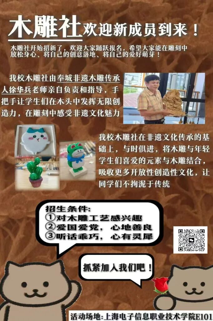 社团简介:木雕作为一种传统艺术形式,不仅展现了艺人的精湛技艺,还承载着丰富的文化内涵。它以刀为笔、以木为纸,将古人对自然的敬畏、对生活的热爱与对美好的祈愿,都镌刻进纹理之间。无论是祠堂梁柱上象征家族兴旺的龙凤纹样,还是案头摆件里寓意平安的瑞兽造型,每一件作品都是特定时代文化的缩影,记录着地域的民俗风情与社会的价值取向。